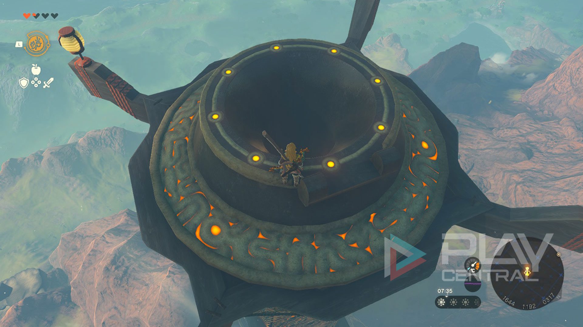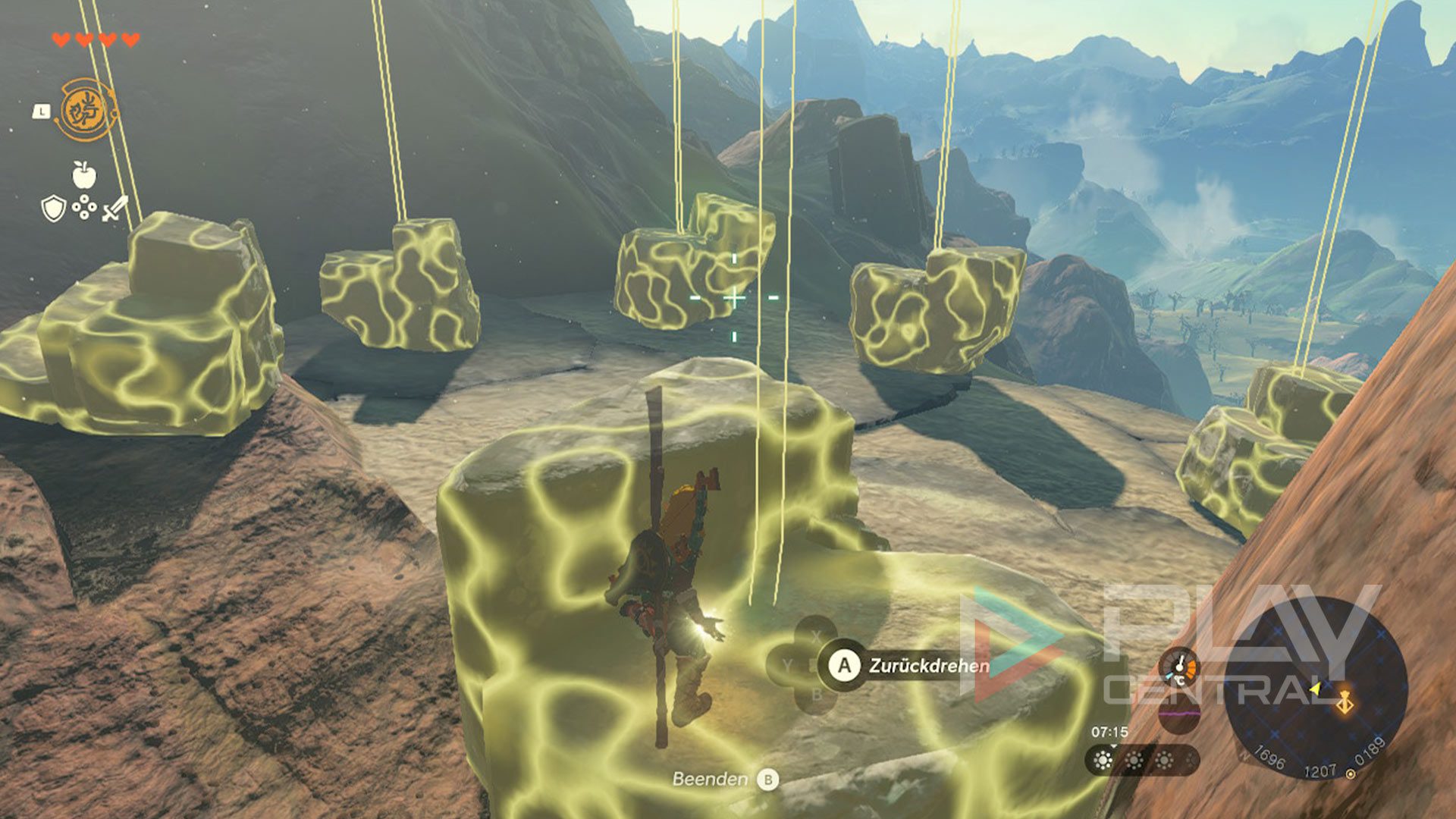 Etwas weiter unter dem Turm befinden sich mehrere Trümmerteile, die in gewissen Abständen in den Himmel steigen. Sobald sich ein solcher Stein auf dem Boden befindet, klettert hinauf und nutzt im Anschluss die Fähigkeit Zeitumkehr. Damit saust der Stein mitsamt Links zurück in die Höhe.