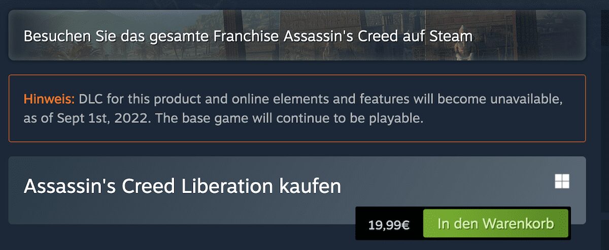 „Für dieses Produkt werden DLCs und Online-Elemente ab dem 1. September 2022 nicht mehr verfügbar sein. Das Basis-Game ist jedoch weiterhin spielbar.“
