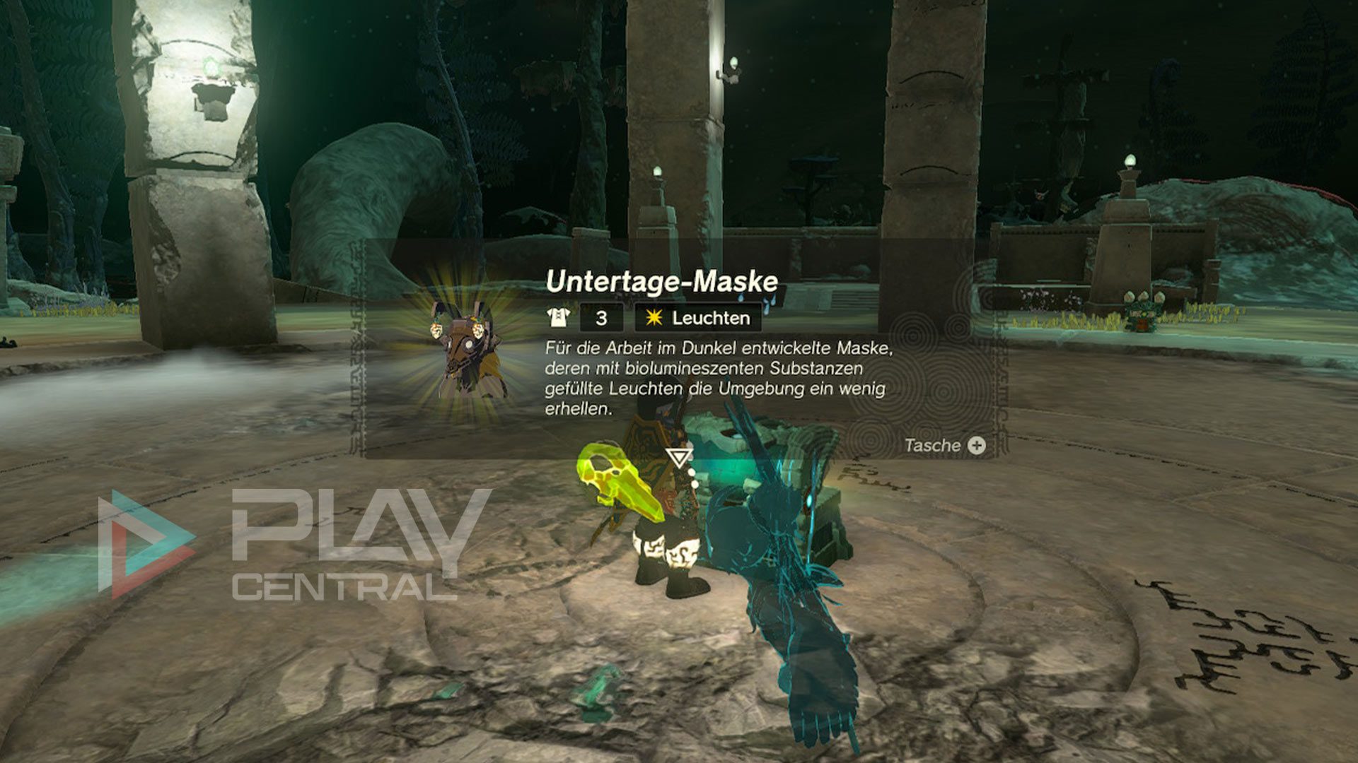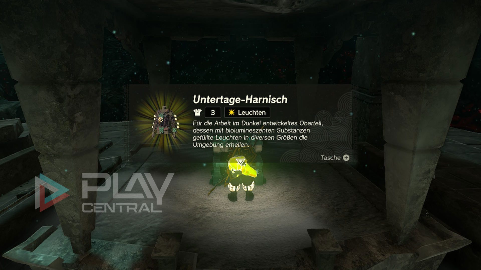 Allerdings ist der Untergrund riesig und eure Ausbeute an Leuchtsamen wird früher oder später zur Neige gehen. Möchtet ihr nicht ständig im Dunkeln stehen, bieten sich Tränke an, die aber ebenfalls irgendwann aufgebraucht sind. Zwar könnt ihr jederzeit eure Vorräte aufbrauchen, es gibt aber auch eine deutlich bessere Alternative in Form der Untertage-Rüstung (Miner’s Armor), die Link leuchten lässt und somit die unmittelbare Umgebung erhellt.