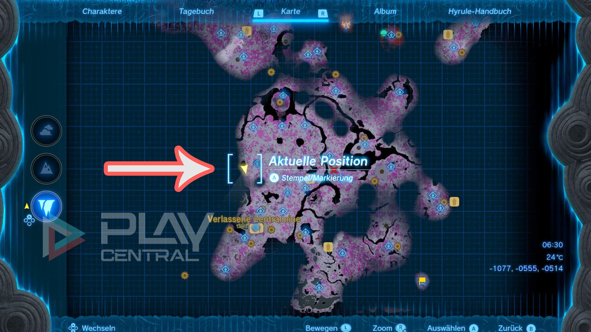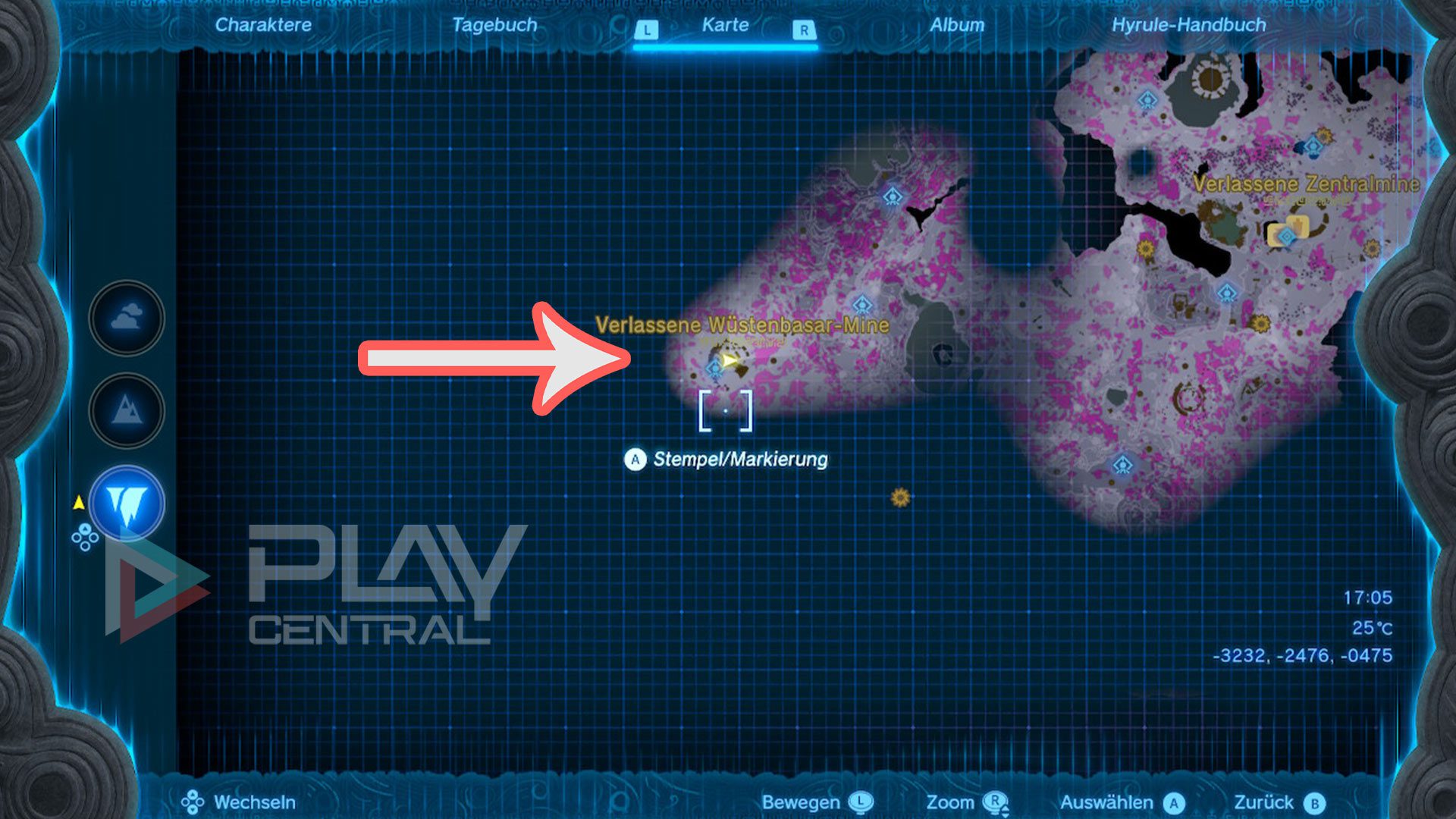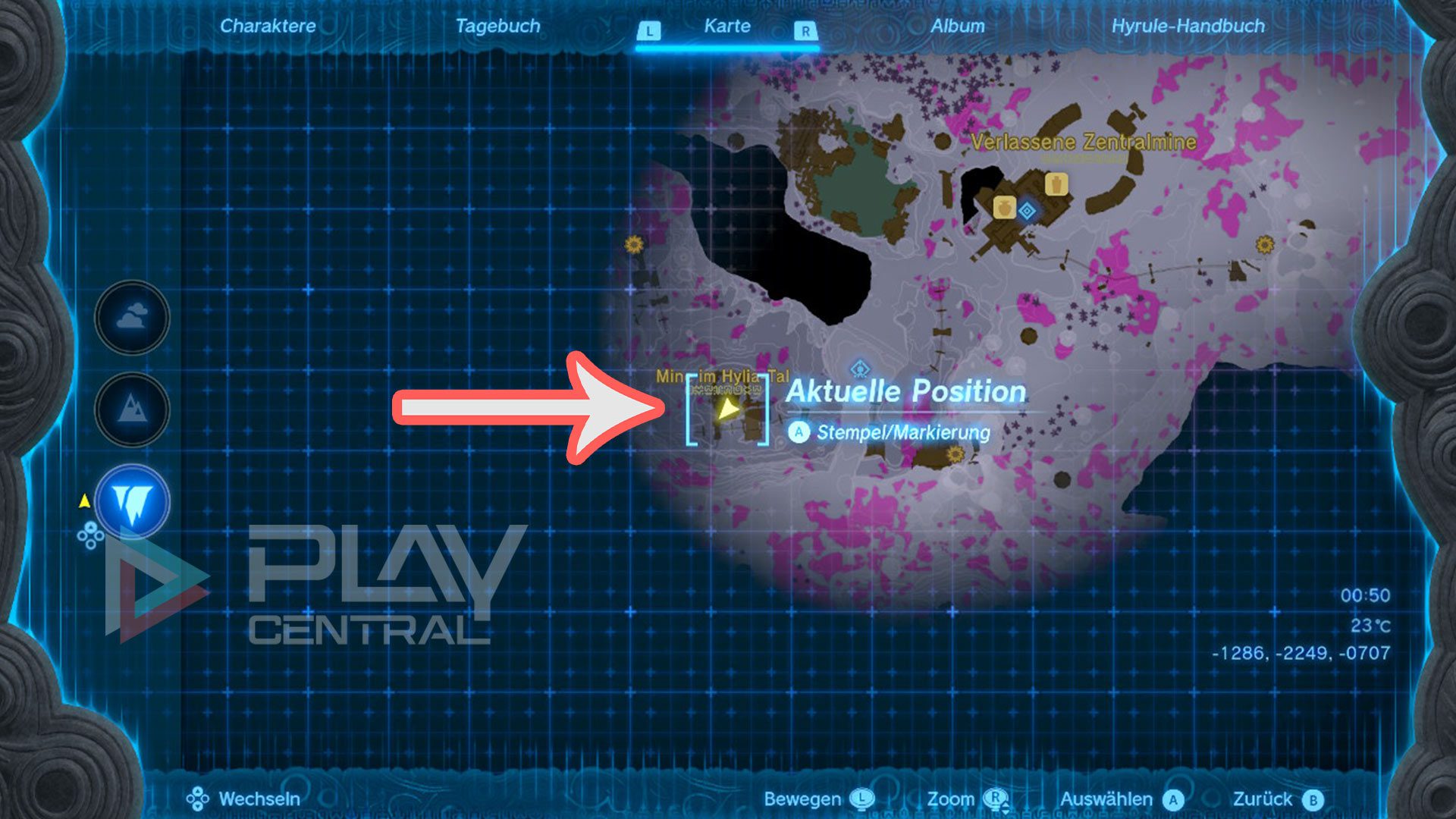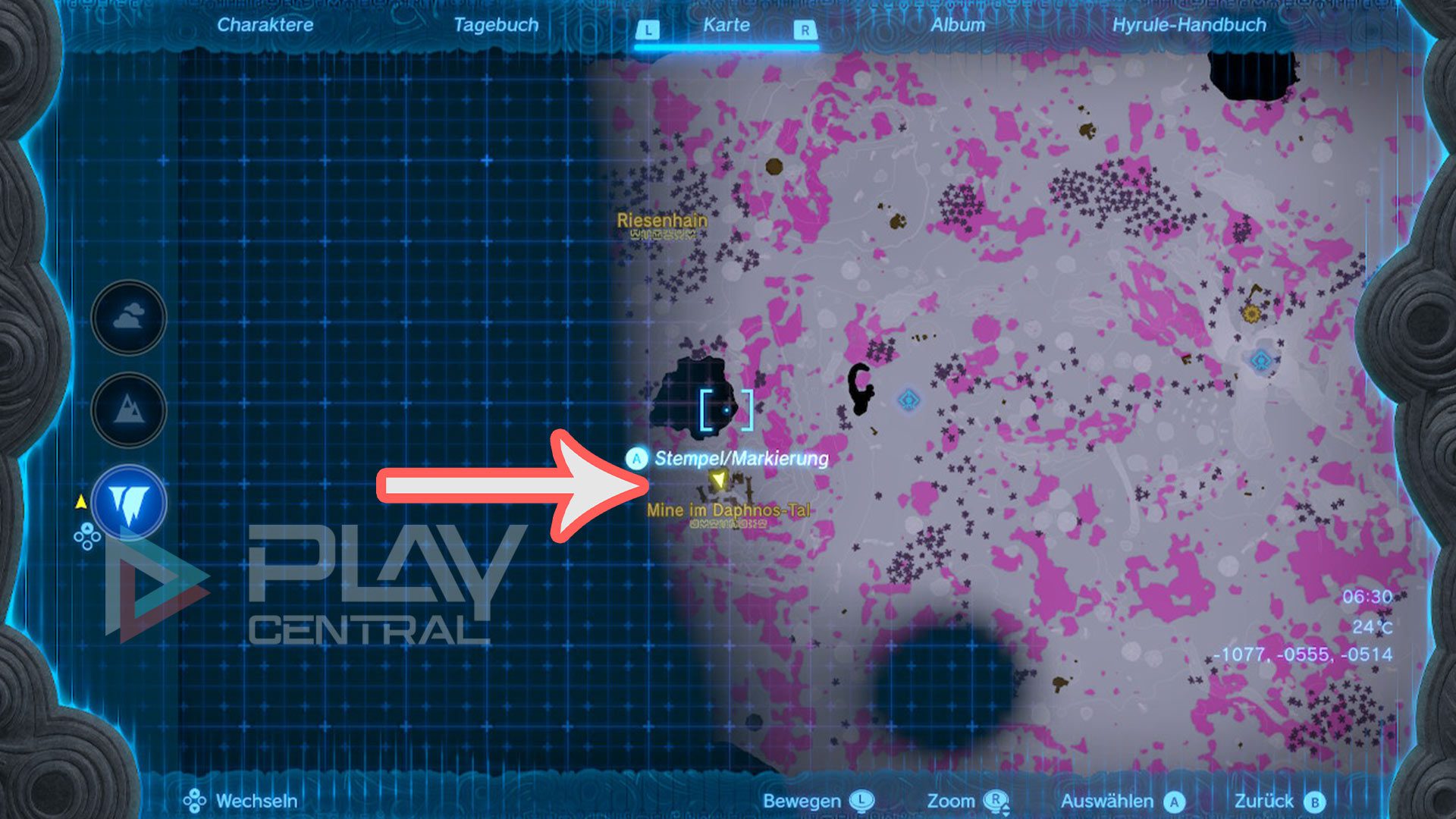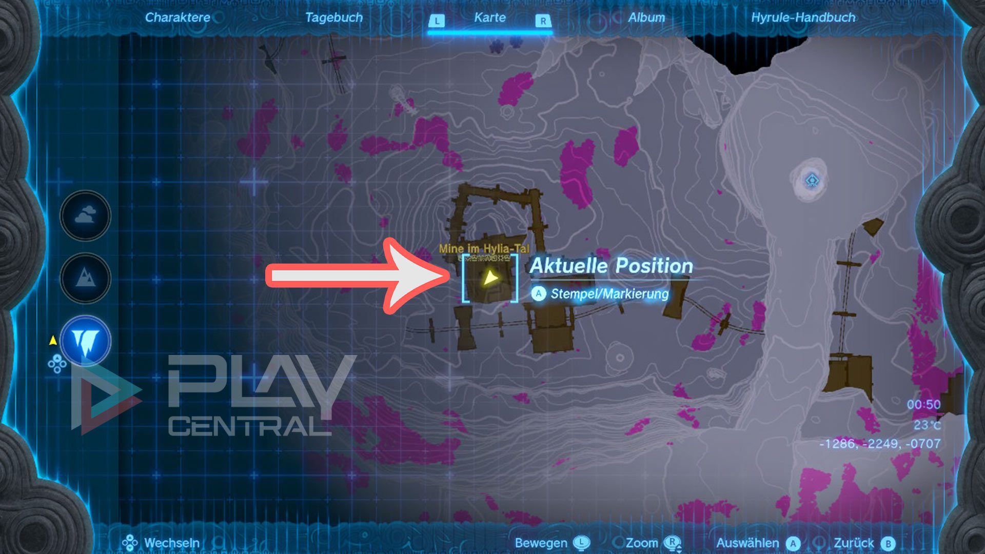 Die Untertage-Hose wartet auf euch ein gutes Stück weiter südlich bei dem Ort Mine im Hylia-Tal. Östlich liegt die Lichtwurzel Nu-koradat-Wurzel. Wenig überraschend liegt diese Mine im Untergrund genau unter dem Hylia-Berg an der Oberfläche. Die genauen Koordinaten sind -1286, -2249, -0707.