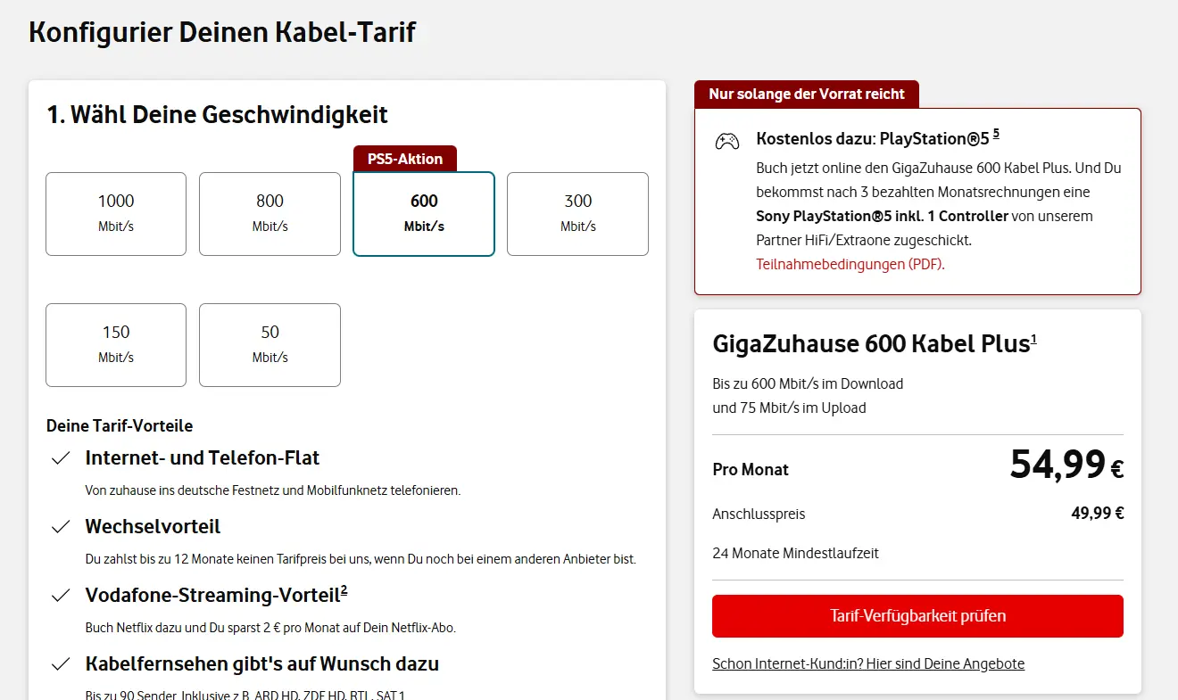 Im Mittelpunkt steht der Tarif GigaZuhause 600 Kabel Plus, der aktuell mit einer PS5 Slim Digital Edition als Zugabe kombiniert wird. Gerade diese Kombination macht den Deal spannend, denn ihr bekommt nicht nur schnelles Internet, sondern gleichzeitig eine der beliebtesten Konsolen auf dem Markt.