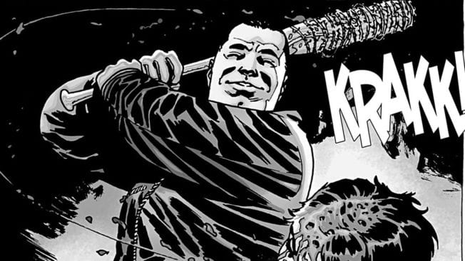 Als Negan in den Comics vom Anführer einer neuen Gruppe erfährt, dass dieser ihre Frauen für sexuelle Gefälligkeiten verpfänden, wird er so wütend, dass er den Anführer mit seinem angsteinflößenden Baseballschläger zu Tode prügelt. Seine gewalttätigen Ausbrüche an teilweise unglücklichen Opfern bringt ihm einen gewissen Ruf ein.