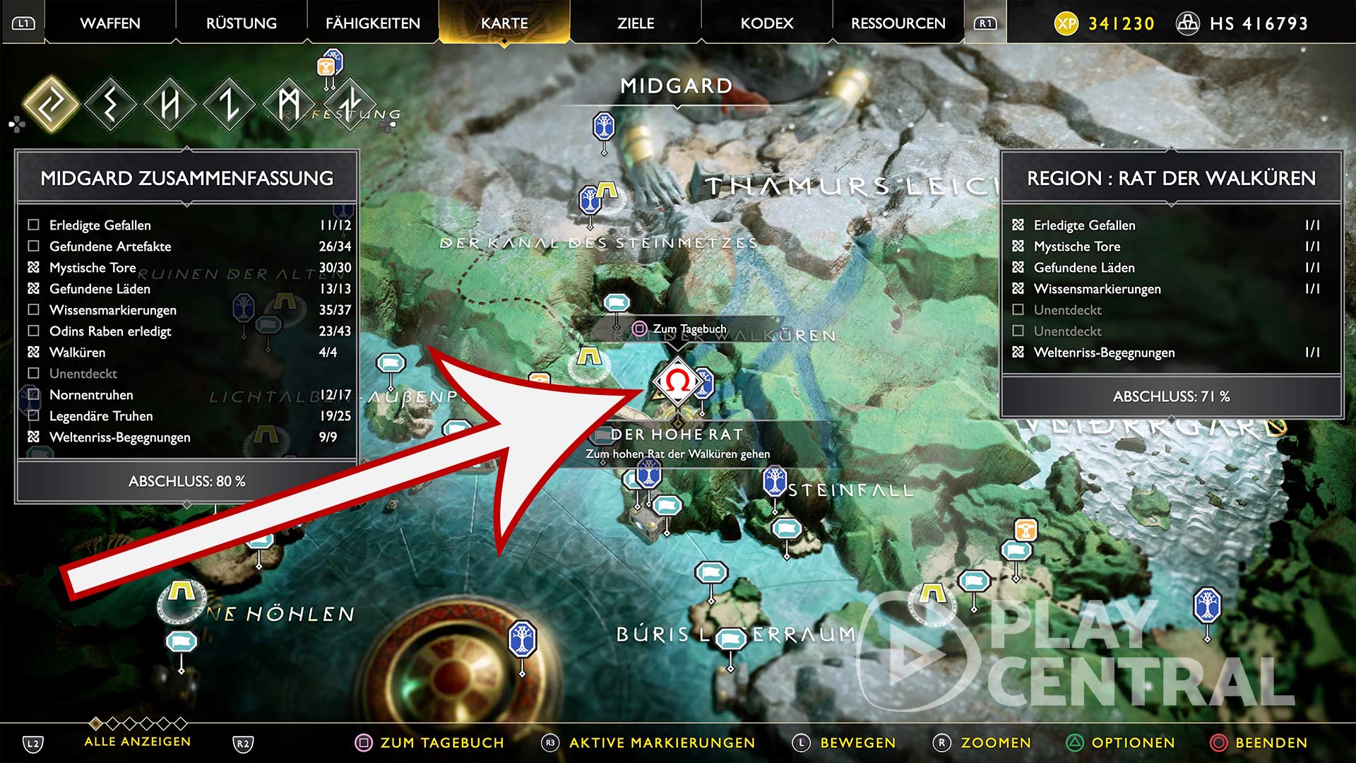 Wie kommt man zum hohen Rat der Walküren? Der Rat der Walküren befindet sich in Midgard, passenderweise in der Region Rat der Walküren. Wir haben euch den genauen Ort auf der folgenden Karte markiert.