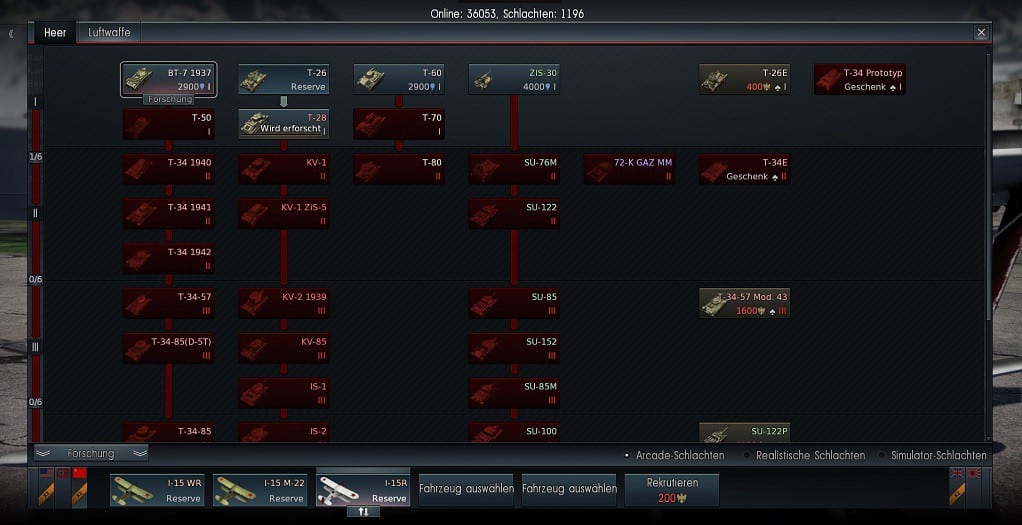 Aktuell sind in der Open Beta nur die Panzer aus Deutschland und der Sowjetunion spielbar, die anderen Länder folgen bald. Wie in solchen Spielen üblich, beginnt man mit einer kleinen Auswahl an Vehikeln der Tierstufe I und muss sich durch Schlachten, Achievements und Erfolge weitere Panzer dazuverdienen. Zum Anfang geht das wirklich schnell und motiviert, erste Panzer kann man recht flott freischalten und darf so auf einen größeren Fuhrpark in den Schlachten zurückgreifen. Dabei unterscheiden sich die Panzer nicht nur in den einzelnen Stufen, sondern auch in den Klassen. Von schnellen, wendigen Panzern mit leichterer Munition bis hin zu den kaum beweglichen Riesen der Schlachtfelder – Ground Forces bietet eine Vielzahl unterschiedlicher Panzer, die sich auch immer vom Gameplay unterscheiden und für verschiedene Missionen und Spielstile geeignet sind. Die Spielmodi sind dabei identisch mit denen, die man als Flieger erleben darf: Im Arcade-Modus erlebt man schnelle Schlachten auf einer der zahlreichen Maps und hat die einfachste Steuerung, welche wirklich intuitiv zu lernen ist – mehr als W,A,S,D und die Maustasten braucht man im Prinzip nicht. Wagt man sich aber an den Modus der "Realistischen Schlachten" oder der "Simulator- Schlachten", dann erwarten einen historische Gefechte, die man nachspielt – inklusive deutlich realistischerem Verhalten der Fahrzeuge und mehr Augenmerk auf Taktik, schließlich kann man sich nicht beliebig neue Panzer für die Schlacht nehmen. Zerstört ist zerstört!