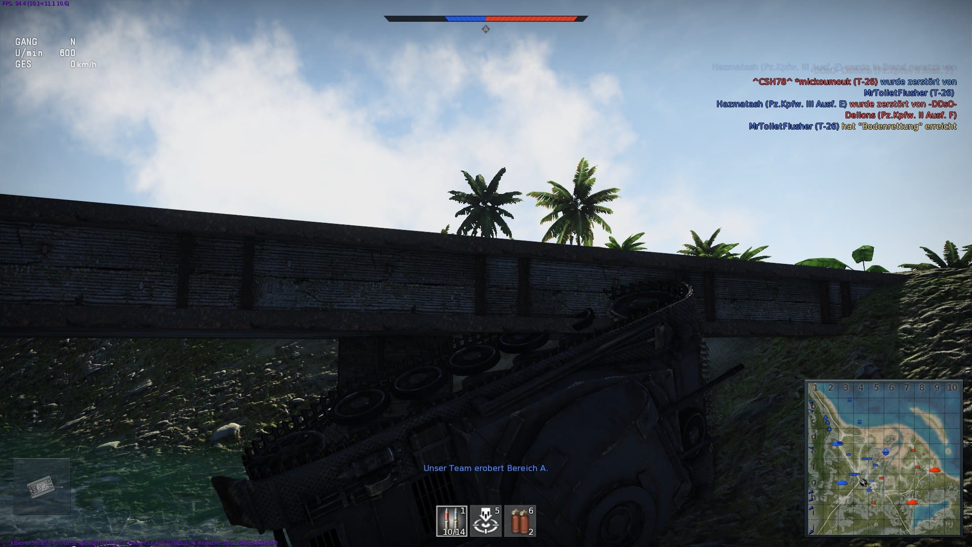 Man kommt schnell rein ins Geschehen und freut sich rasch über erste Kills, die man landet. Allerdings ist auf dem Schlachtfeld nicht alles Gold, was glänzt. Die Maps verhindern teilweise einen reibungslosen Spielverlauf durch ihr Gelände, welches für Panzerschlachten mit all seinen Winkeln und Hügeln oftmals als ungeeignet zu bezeichnen ist. Das Matchmaking trifft nicht immer die richtigen Entscheidungen und würfelt schonmal Anfänger mit erfahrenen Veteranen in eine Schlacht, die dann durch bessere Panzer einige Vorteile haben. Im Arcade-Modus wird man schnell abhängig von der Zielhilfe, welche in Form eines Zielkreuzes auftaucht. Ist das Kreuz rot, dann würde ein Treffer (wahrscheinlich) keinen Schaden anrichten. Bei gelber und grüner Farbe sieht es gut aus – der Treffer schadet dem feindlichen Panzer. Das nimmt ein bisschen die Herausforderung und vereinfacht die Schlacht sehr, geht aber gut von der Hand. Man fühlt sich trotz der Kritikpunkte wohl auf dem Schlachtfeld und kann ein paar spannende Runden erleben. Oder man parkt platzsparend seinen Panzer quer an einer Brücke!