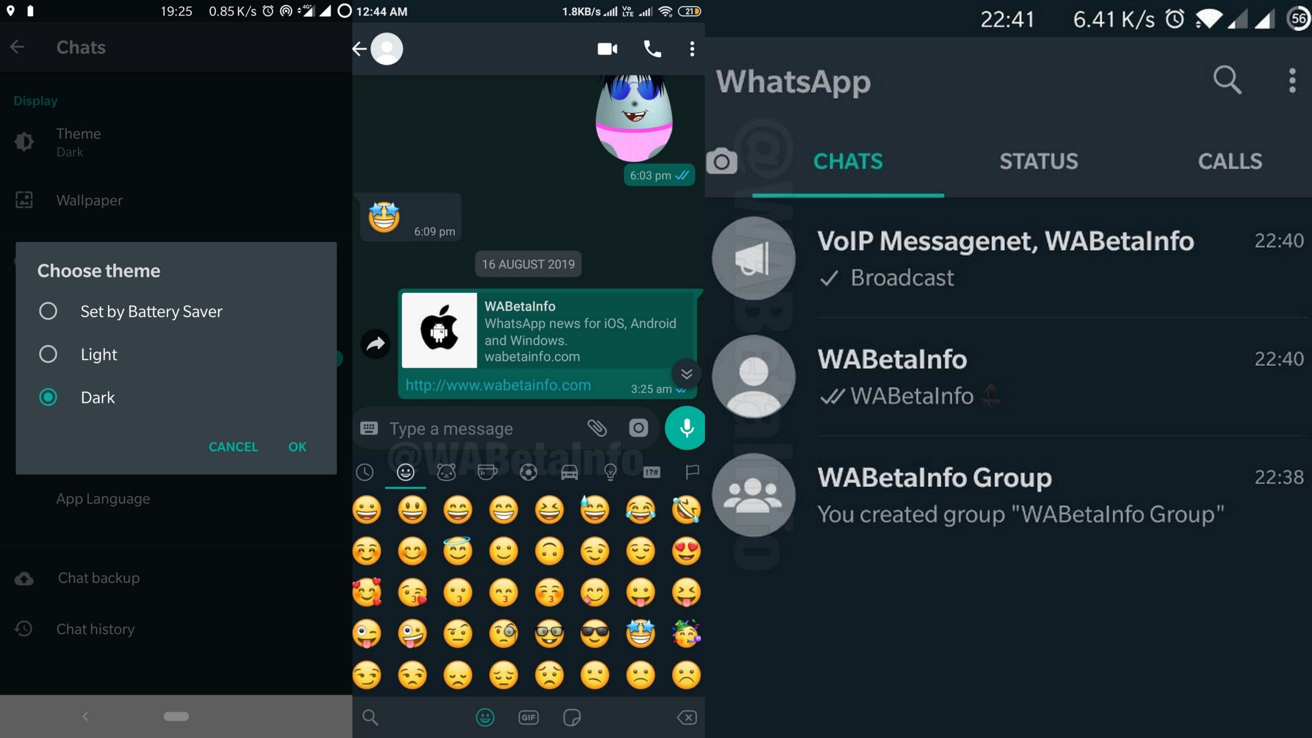 Zwischen drei Modi soll dabei künftig gewählt werden können: Hell, Dunkel und Festlegen durch Batteriesparmodus. Sollte man in den allgemeinen Optionen seines Android-Geräts ohnehin das Dark Theme aktiviert haben, greift diese systemweite Einstellung dann auch auf WhatsApp über.