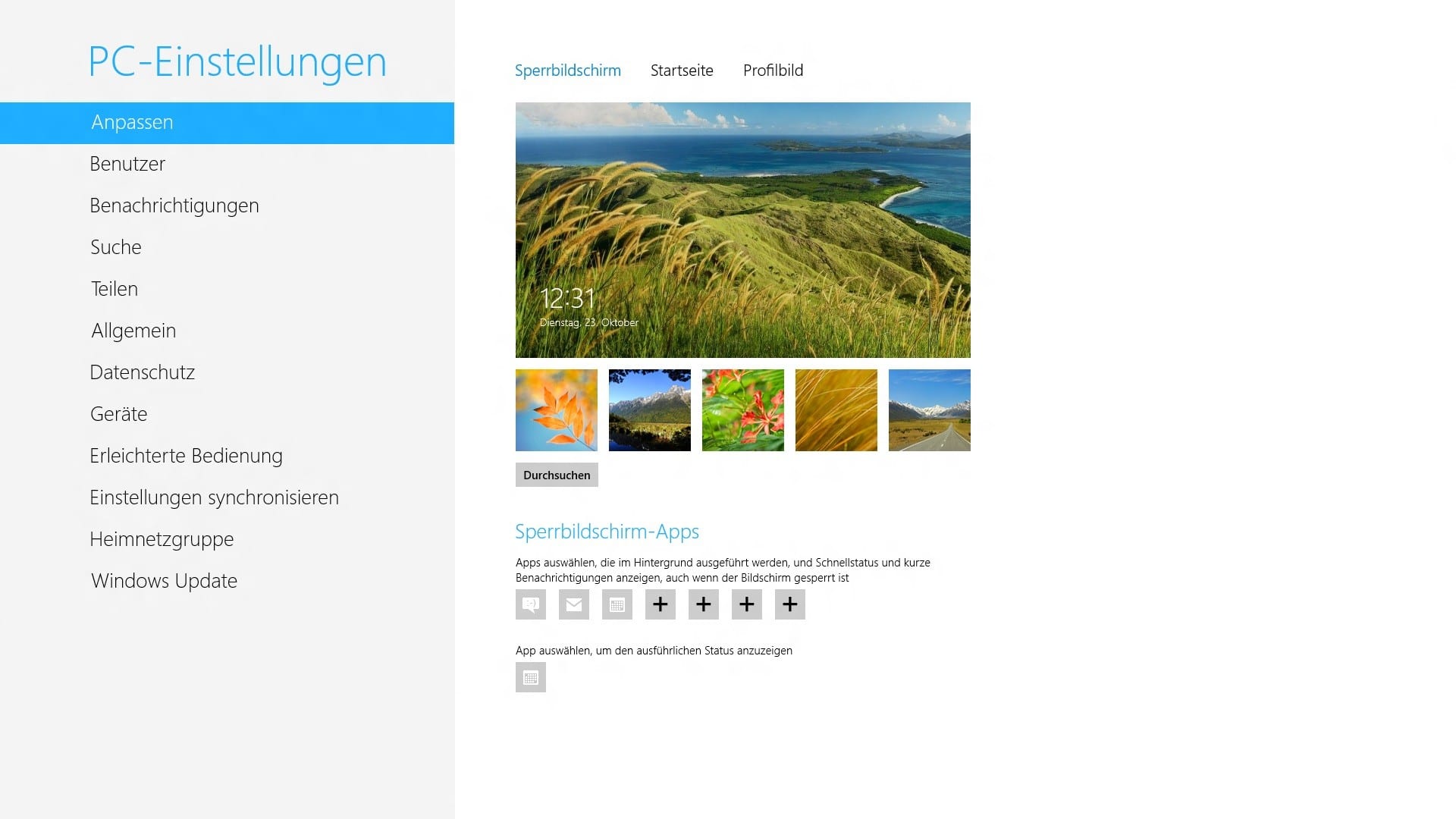 Leider kommt der Startbildschirm an sich recht statisch und trotz verschiebbarer Elementen wenig individuell daher. Auch von eigenen Einflüssen in Form eines eigenen Desktop-Hintergrundes muss man sich im Kachel-Bereich verabschieden. Fährt man mit der Maus über den rechten Bildschirmrand und begibt sich in die PC-Einstellungen, so kann man zwar Sperrbildschirm und Startseite modifizieren, kann sich aber nur durch eine Auswahl an Farbschemata und wenige Muster klicken. Zugegeben gilt dies nicht für den Sperrbildschirm – diesen bekommt man aber ohnehin kaum zu Gesicht.