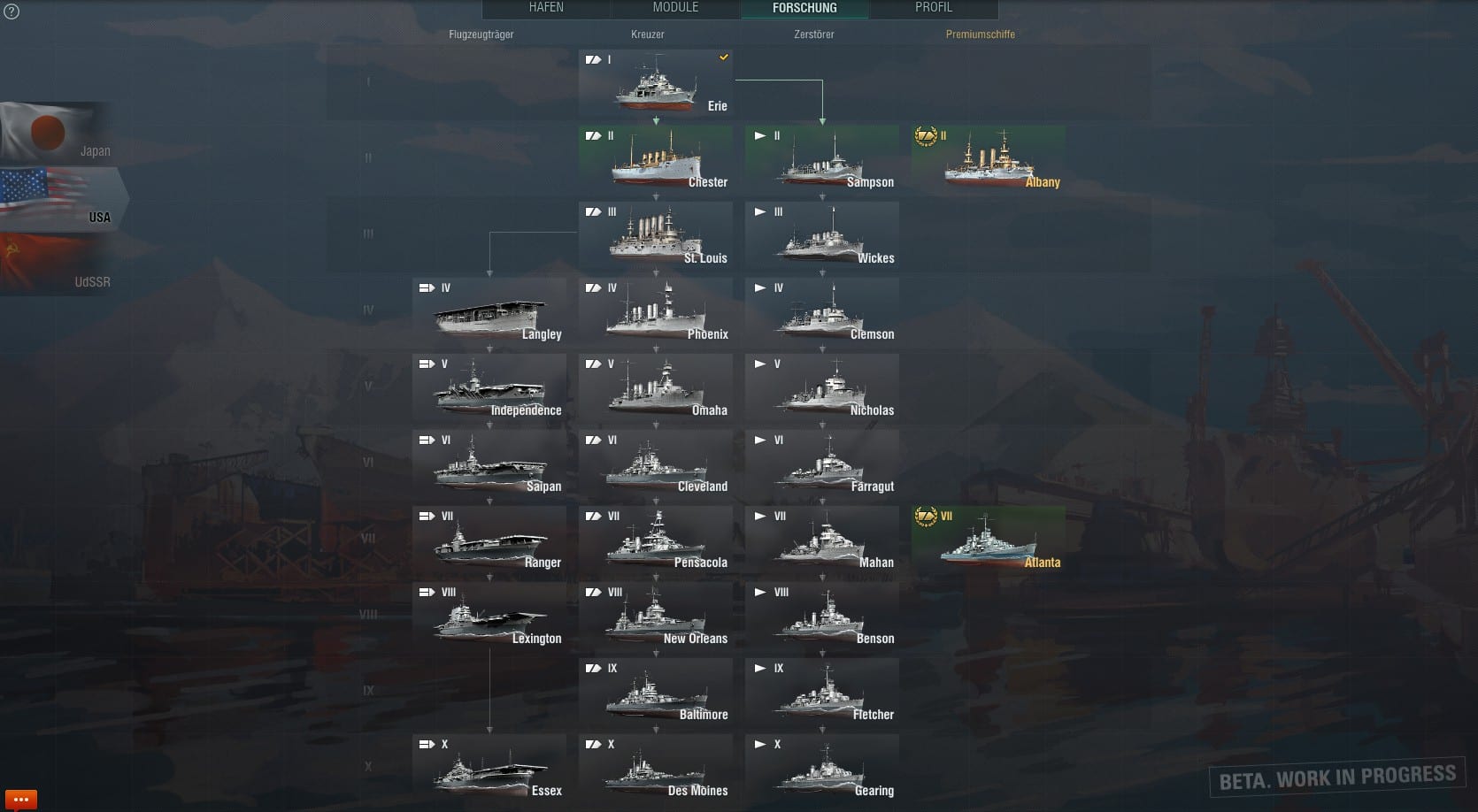 Und die Arbeit hat sich gelohnt: Egal ob Baltimore, Lexington, Kuma oder Yamato – wir finden eine sehr breite Auswahl bekanntet Typen wieder, die allesamt durch eigene Spezialisierungen aufwarten. Wie gewohnt muss sich der euphorische Kapitän auch bei World of Warships von Tier zu Tier angeln. Jede Stufe bringt modernere Technik, bessere Waffen, dickere Panzerung und schnellere Schiffe. Zusätzlich dazu können wir alle erworbenen Schiffe auch noch weiter verbessern. Ziemlich viel Theorie, aber so kennt man es eben von Wargaming. Als Neueinsteiger braucht es schon seine Zeit, bis man das komplexe System aus Schiffstypen, Modulen und Forschung begriffen hat. Aber das motiviert umso mehr, die vielseitigen Möglichkeiten auszuschöpfen.