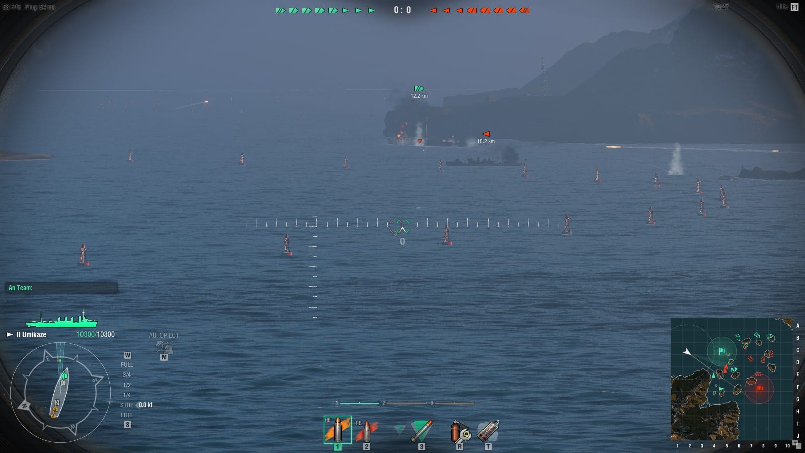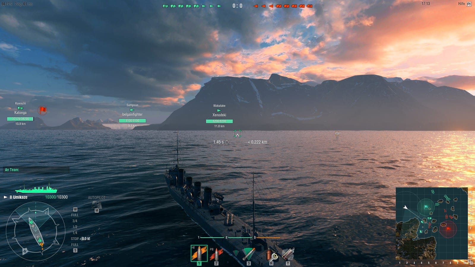 Wobei „stürmen“ jetzt nicht gerade treffend gewählt ist, denn eigentlich ist die Geschwindigkeit der Schiffe, vor allem in den niedrigen Tiers, noch extrem langsam. So ein Kriegsschiff ist eben kein Düsenjet. Wenn wir dann also in unserer ersten Runde die Maschinen anschmeißen und die frische Brise erwarten, kommt es einem so vor, als würden wir kraftlos auf der Stelle paddeln. Nur sehr mühselig kommt unser Kahn voran und so dauert es knapp eine Minute, bis wir volle Geschwindigkeit erreicht haben. Die wird im Übrigen originalgetreu in Knoten gemessen.