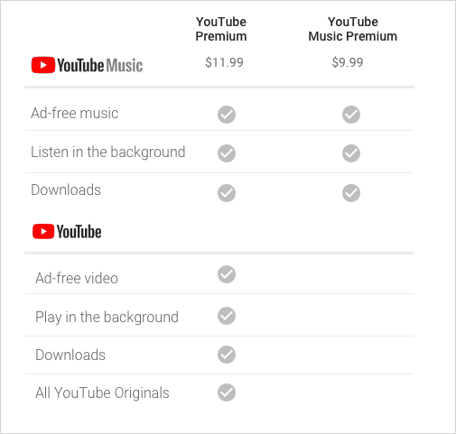 Weiterhin gibt es, anders als bei Play Music, das monatlich 9,99 Euro kostet, ein kostenloses Angebot von YouTube Music. Dieses steht in direkter Konkurrenz mit dem Musik-Streamingdienst Spotify, wovon ebenfalls eine kostenlose Version angeboten wird, die über Werbung finanziert wird.