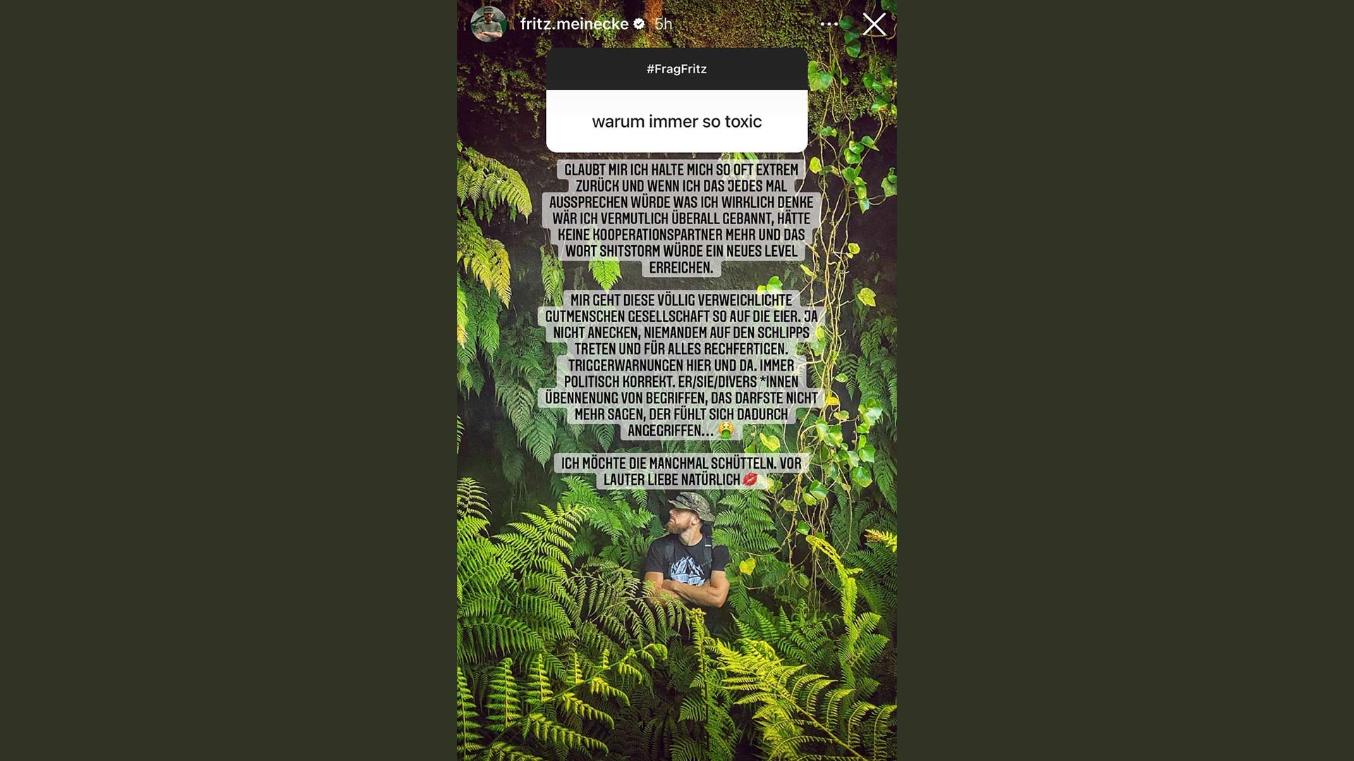 Fritz Meinecke schreibt in seiner Story offen und unverblümt, dass ihn die völlig „verweichlichten Gutmenschen in der Gesellschaft nerven“ würden. Er müsse sich ständig für alles rechtfertigen, während sich alle auf den Schlipps getreten fühlen. Es werde erwartet, dass man sich zu jeder Zeit politisch korrekt verhält. Er meint: