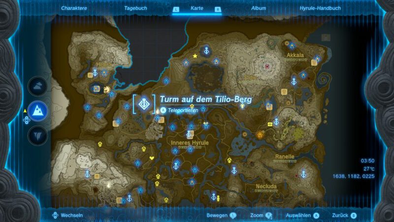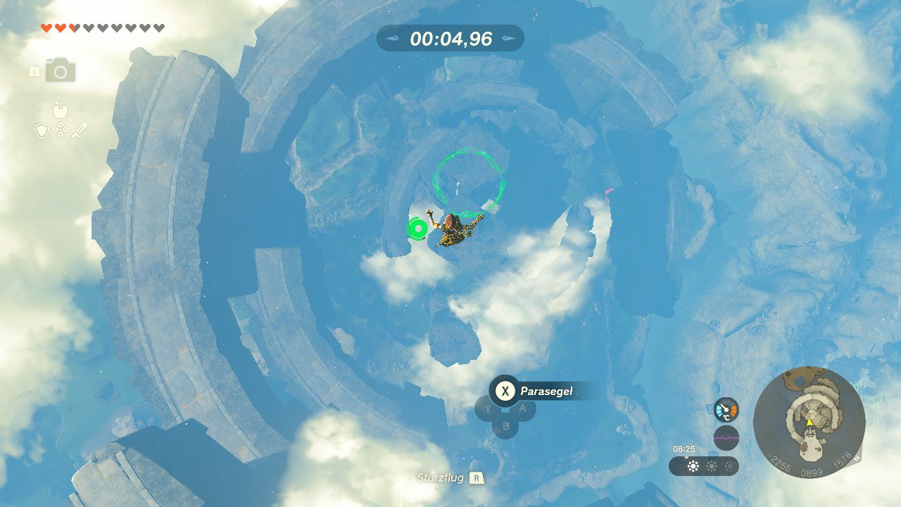 Im Westen von Inneres Hyrule befindet sich der Turm auf dem Tilio–Berg und genau von diesem Turm wollt ihr euch in die Luft schleudern lassen. Nun müsst ihr das Parasegel nutzen, um im Himmel nach Süden zu gleiten, wo ihr die kreisförmige Insel der Heldenmutprobe erblicken könnt. Gleitet dorthin und landet auf der Insel.