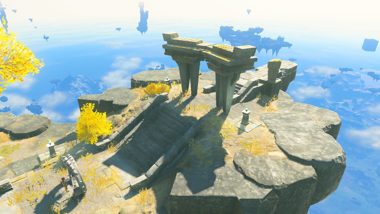 Habt ihr euch Harnisch und Beinschutz geschnappt, fehlt nur noch die Maske. Reist dafür weit in den Osten des Landes, nämlich zum Turm auf der Ranelle-Spitze, wo es wie gewohnt erst einmal weit nach oben geht. Die gesuchte Insel mit der Herausforderung liegt dieses Mal im Osten. Sollte die Ausdauer bis dahin nicht reichen, macht auf einem der vielen Mini-Inseln Rast.