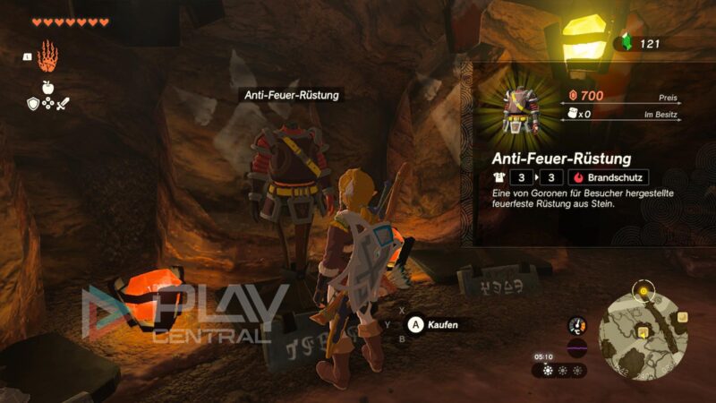 Es gibt nämlich diverse Orte im Spiel, die einen echten Brandschutz erfordern. Dazu zählen einige Teile des Nordosten, so wie die Region rings um den Todesberg. Doch auch im Untergrund, in den Tiefen, gibt es hier und da Lavastellen, die uns in Flammen aufgehen lassen. Und das sogar dann, wenn wir nicht direkt in der Lava stehen. Link fängt buchstäblich Feuer – und das wollen wir doch nicht?