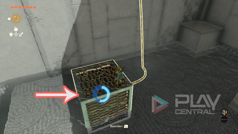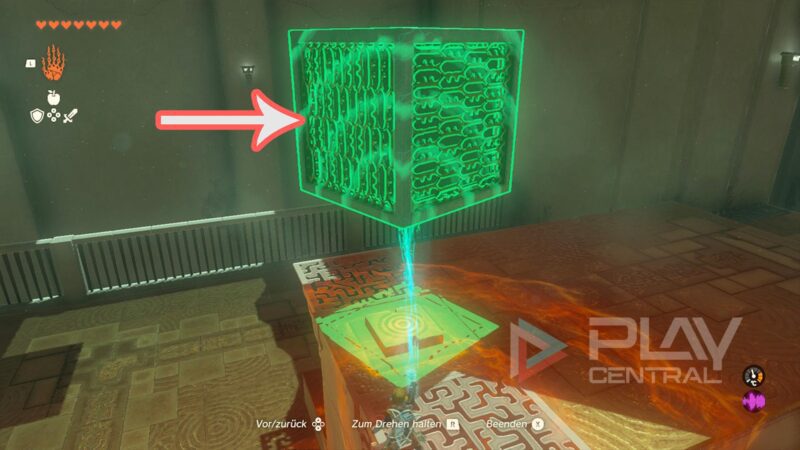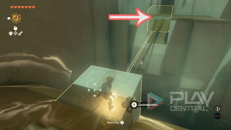 Betätigt den Schalter und lasst den Felsblock zurückkommen. Jetzt stellt ihr euch auf den Würfel und aktiviert eure Fähigkeit Zeitumkehr. Dann schießt der Block (in der Zeit zurück) wieder nach vorne.