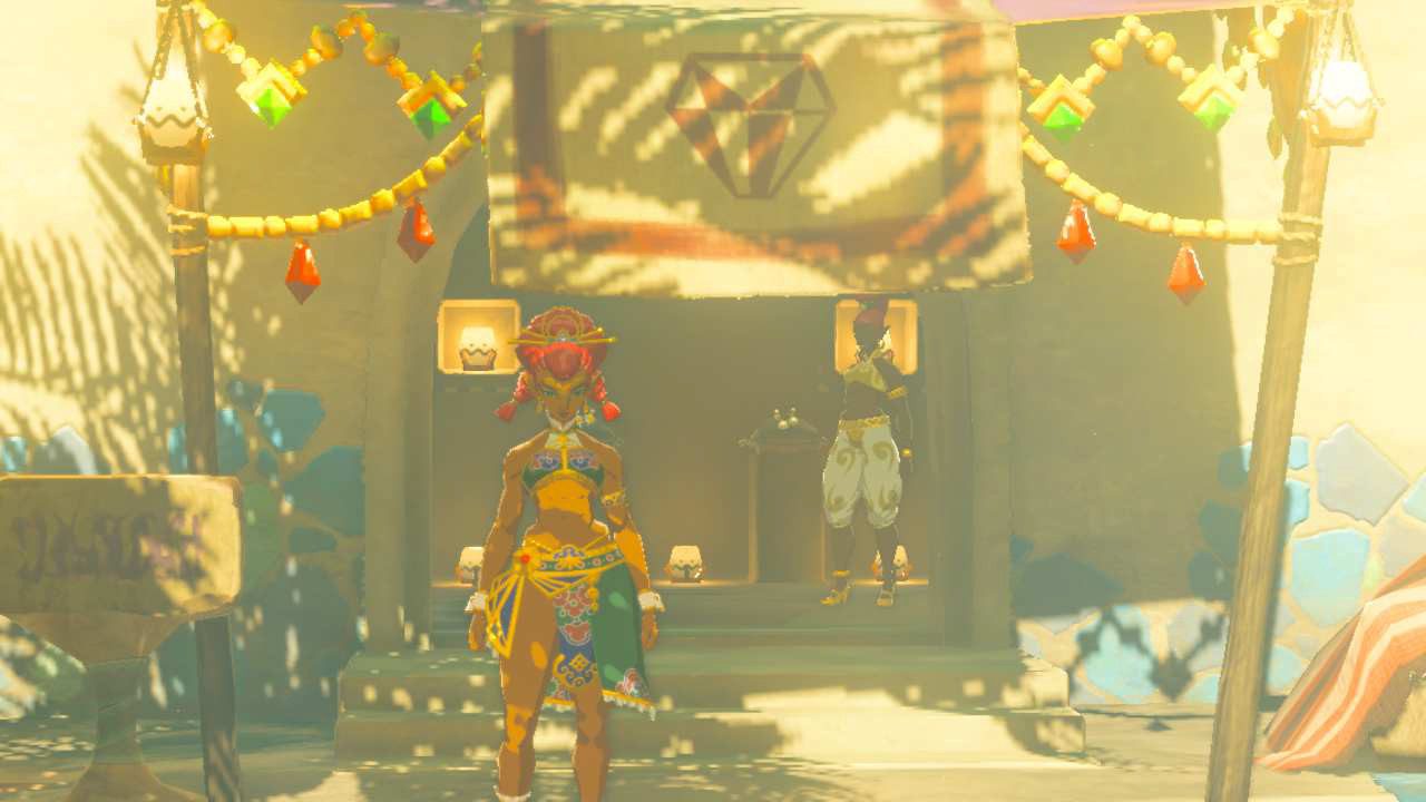 - Wenn ihr euch im Verlauf der Gerudo-Quest Riju aus Gerudo-Stadt auf die Schlacht vorbereitet, sucht Padoru auf, um euch mit Waffen einzudecken, darunter auch ein Gerudo-Messer.
