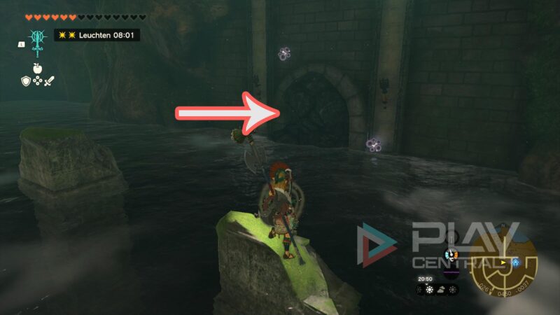 Nach der kleinen Brücke mit Knochengegnern haut ihr die blaue Wand vor euch weg und lauft dann nach unten, rechts im Kreis. Ihr lauft so lange im Kreis, bis ihr an eine Wasserstelle kommt. Schwimmt kurz in die Mitte und schaut gen Osten.
