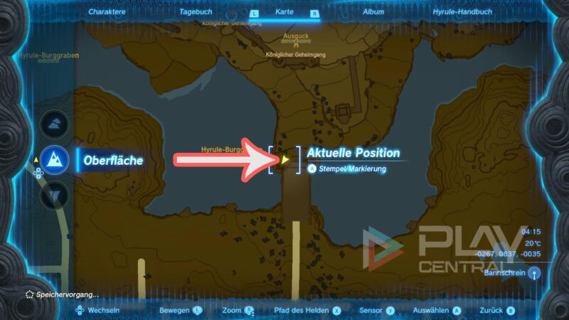 Wo finde ich die Hylia-Rüstung? Auch dieses Rüstungsteil ist im Grunde ganz in der Nähe (vom aktuellen Punkt aus). Wir müssen dem Königlichen Geheimgang also weiter in den Norden folgen. Auf unserer Karte erkennt ihr den genauen Standort der Truhe mit der Rüstung.