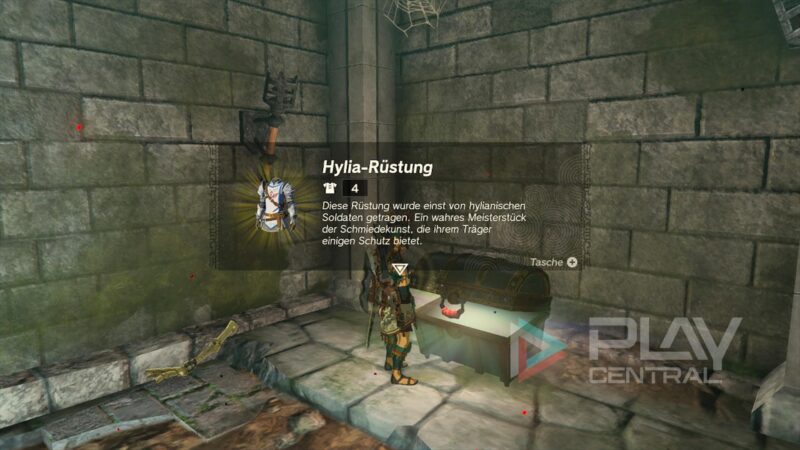 Hier finden wir nun die dritte Truhe und die Hylia-Rüstung. Jetzt könnt ihr das ganze Rüstungsset anlegen!