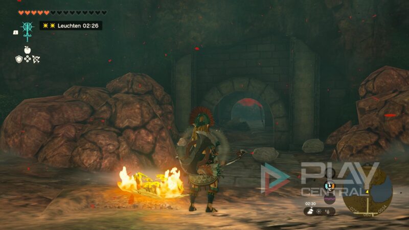 Rechts vom Hauptraum abgehend sehen wir einen gigantischen Felsen im Boden. Hebt ihn mit der Ultra-Hand hoch und legt so das Loch im Boden frei.