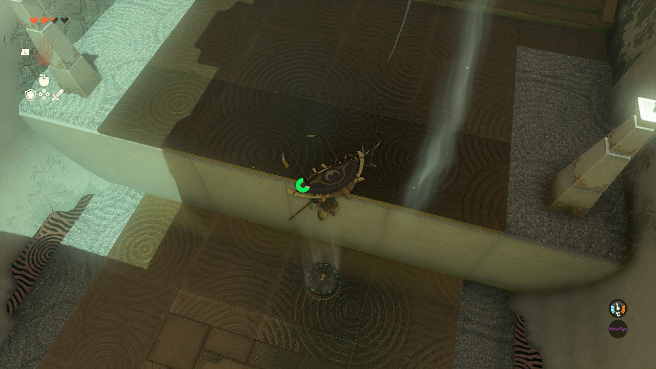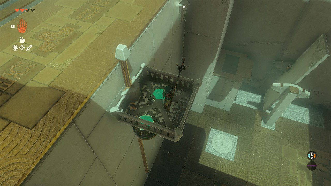 Im letzten Rätsel-Raum dieses Schreins könnt ihr euch zu eurer Rechten erst einmal die Kiste mit dem Opal schnappen. Bringt dafür einen Ventilator an der Steinwand an, auf welcher die Kiste sich befindet. Aktiviert den Ventilator und die Wand wird nach oben gedrückt, wodurch sie eine Brücke bildet. Perfekt, um mit Deckensprung nach oben zu gelangen.