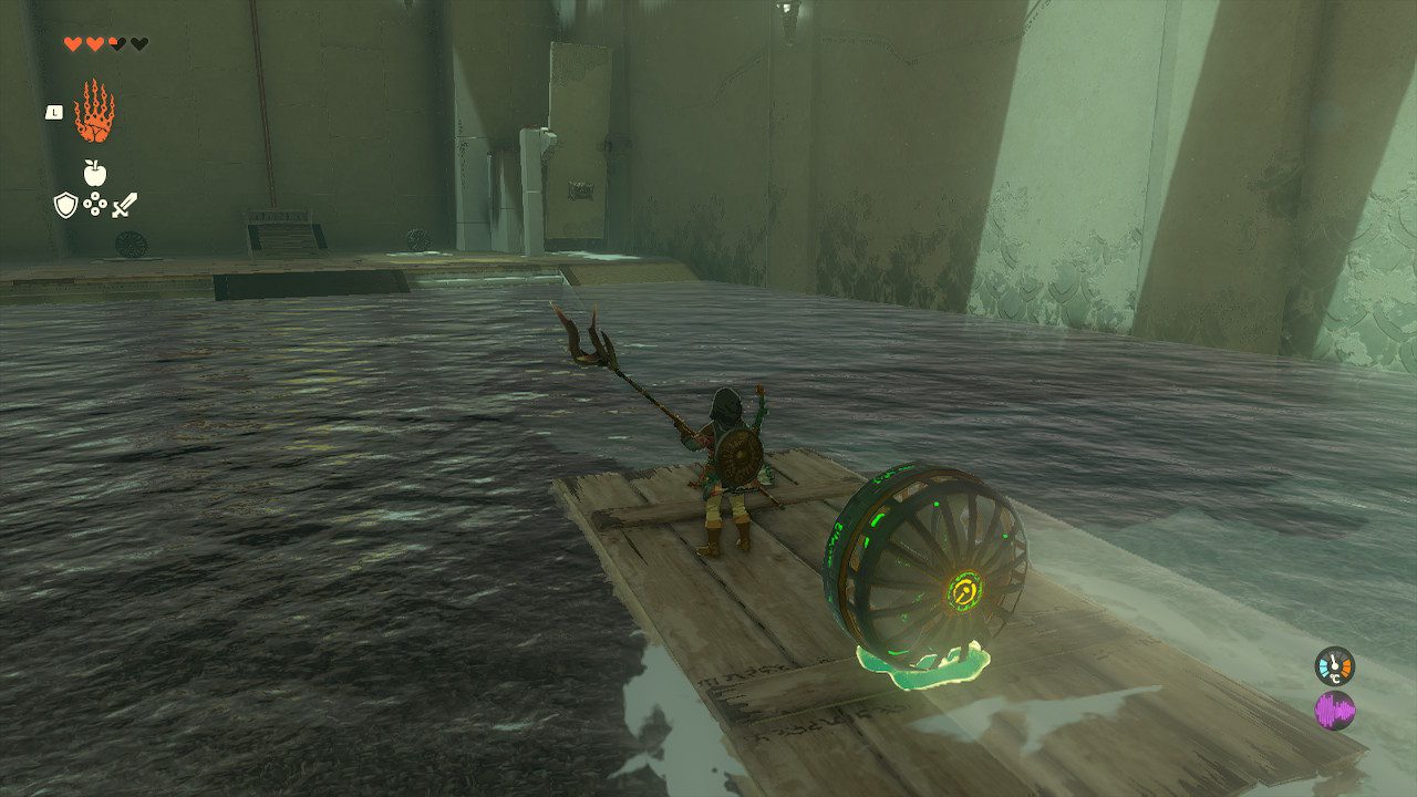 Habt ihr das erste Rätsel gelöst, findet ihr euch in einem großen Raum wieder, in welchem euch viel Wasser von der anderen Seite trennt. Um hier voranzukommen wird euch ein Holzbrett und ein Ventilator zur Verfügung gestellt. Auch hier ist es wieder die Fähigkeit Ultra-Hand, die euch zum Ziel führt, aktiviert sie also und schnappt euch damit das Holzbrett.