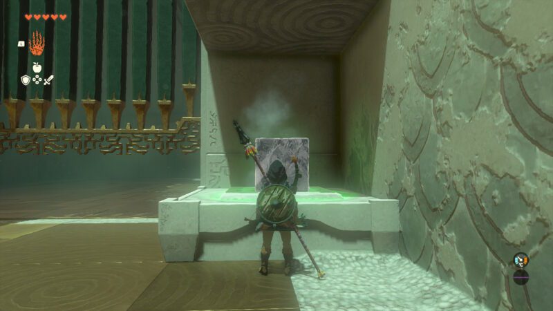 Und das war es auch schon. Damit habt ihr die Rätsel in diesem Schrein gelöst. Nähert euch wie gewohnt dem leuchtenden Kreis und interagiert damit, um ein Segenslicht zu erhalten. Habt ihr vier dieser Lichter gesammelt, könnt ihr eine Statue der Göttin aufsuchen und euch im Austausch einen Herz- oder einen Ausdauercontainer geben lassen.