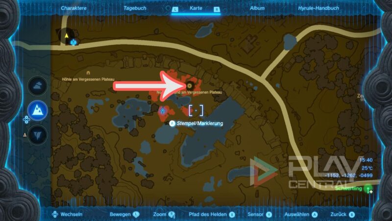 Wir müssen auf das Vergessene Plateau, also ins Startgebiet von BotW. Hier gibt es im Norden, direkt bei der großen Mauer, ein gigantisches Loch im Boden. Das ist der Nord-Abgrund am Vergessenen Plateau. Springt rein und es geht weiter (siehe Bild).