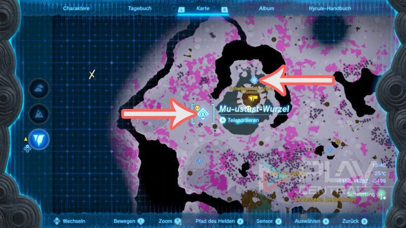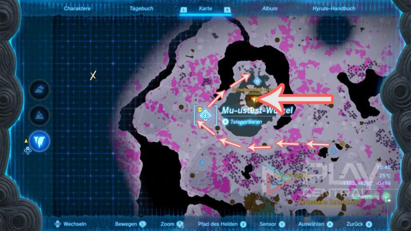 Ihr solltet bei der Mu-ustust-Wurzel einen Zwischenstopp einlegen, damit ihr die Arena auf der Karte vollends einsehen könnt. Lauft dann links am Wasser vorbei und von hier aus gen Norden zum Eingang der Schwimmenden Arena.
