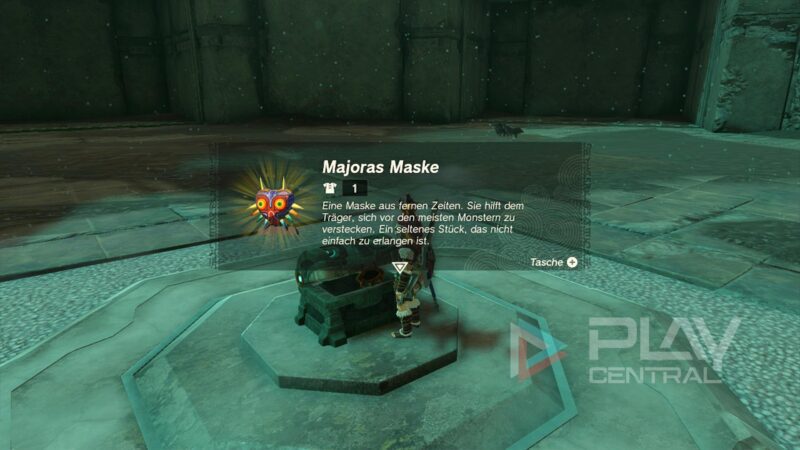 Wenn ihr mit dieser Vorgehensweise schließlich alle fünf Gegner ausgeschaltet habt, wird die Truhe in der Mitte der Arena freigeschaltet. Es wartet ein einzigartiger Schatz: Majoras Maske auf euch!