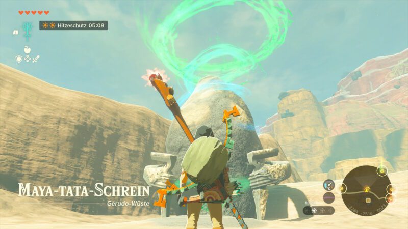 Der Maya-tata-Schrein ist einer der wenigen Schreine im Land der Gerudo, den ihr nicht großartig suchen müsst. Wahrscheinlich ist, dass ihr an ihm ganz automatisch vorbeikommt, wenn ihr dem Hauptziel Untersuche die vier Regionen nachgeht, denn in diesem Fall verschlägt es euch früher oder später auch in die Gerudo-Wüste.