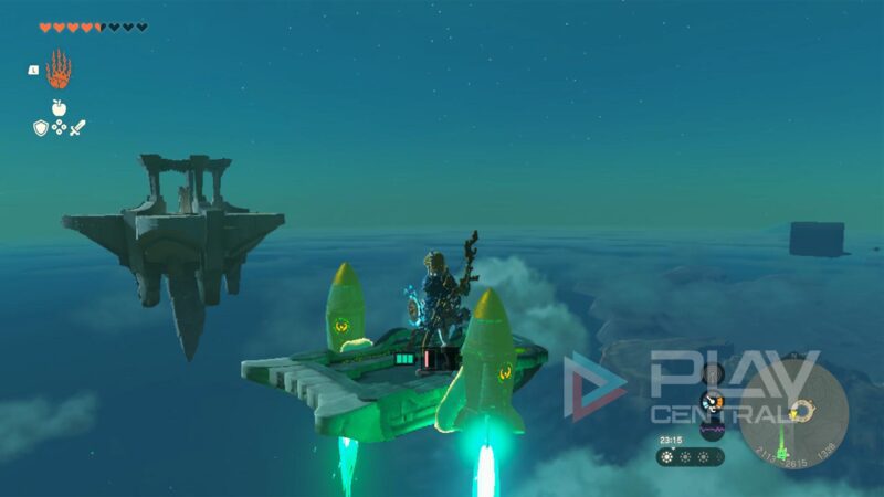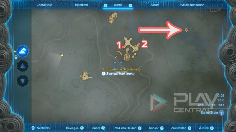 Diese Steinplatte könnt ihr von mehreren Seiten anfliegen, aber wir haben uns für den Turm im Gerudo-Tal entschieden. In der Luft gleitet ihr dann gen Osten, bis in die Mitte des Archipels von Ost-Gerudo.