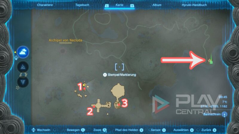 Diese Platte befindet sich im äußersten Südosten der Weltkarte, zwischen dem Archipel von Süd-Ranelle und dem Archipel von Necluda. Die genaue Position befindet sich in der Nähe von Hateno und dem Hateno-Institut.