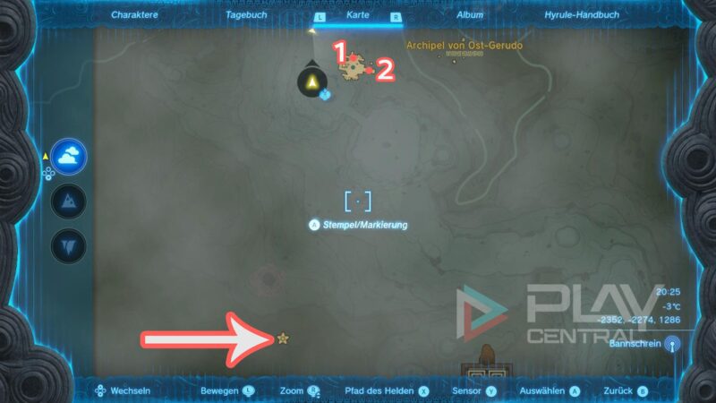 Startet dann beim Turm in den Labella-Sümpfen und springt in die Luft gen Osten. Landet bei den Felsen in der Nähe (1). Arbeitet euch dann vor und springt mit dem Katapult-Sonauteil bis in die Mitte, die eine x-förmige Formation (2) aufweist.