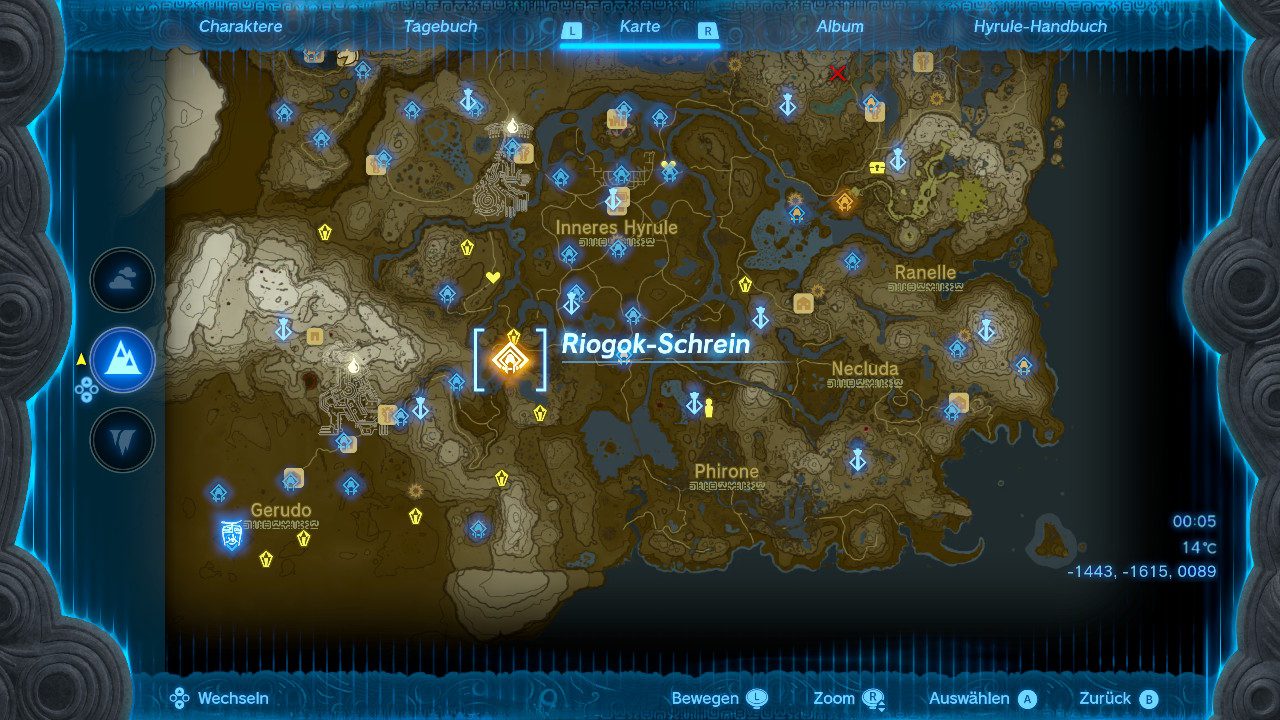Entweder lauft ihr von dem Gebiet Krötenteich aus einfach nach Westen, in die Schlucht, oder ihr sucht den Kartografieturm in der Ebene von Hyrule auf und lasst euch von ihm in die Luft schleudern. Gleitet dann mit dem Parasegel nach nach Süd/Südwest und ihr bewegt euch direkt auf den Riogok-Schrein zu, den ihr dann nur noch aktivieren und betreten müsst.