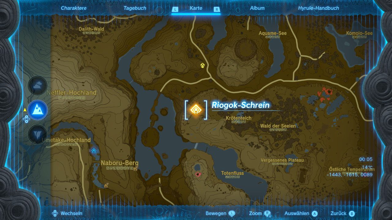Bevor ihr ein wenig mit der Physik von The Legend of Zelda: Tears of the Kingdom experimentieren könnt, müsst ihr den Riogok-Schrein natürlich erst einmal finden. Dafür reist ihr von Inneres Hyrule aus nach Südwesten, also in Richtung Hylia-Berg. Westlich vom Krötenteich, umgeben von hohen Felswänden, werdet ihr schließlich fündig.