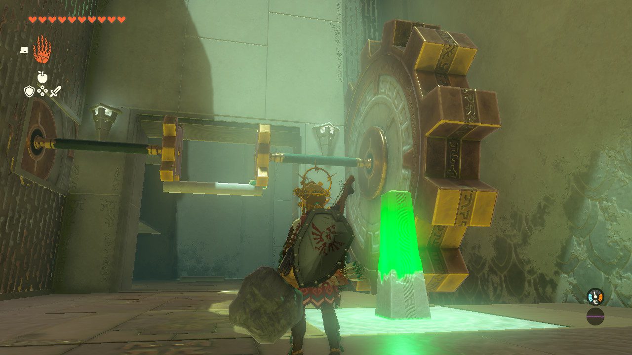 Ihr müsst lediglich die Stange mit eurer Fähigkeit Ultra-Hand vom Boden aufheben und zwischen die beiden kleinen Zahnräder der Apparatur kleben. Habt ihr das getan und beide Zahnräder sind ordentlich miteinander verbunden worden, müsst ihr dem leuchtenden Kristall nur noch einen freundlichen Klaps mit eurer Waffe geben.
