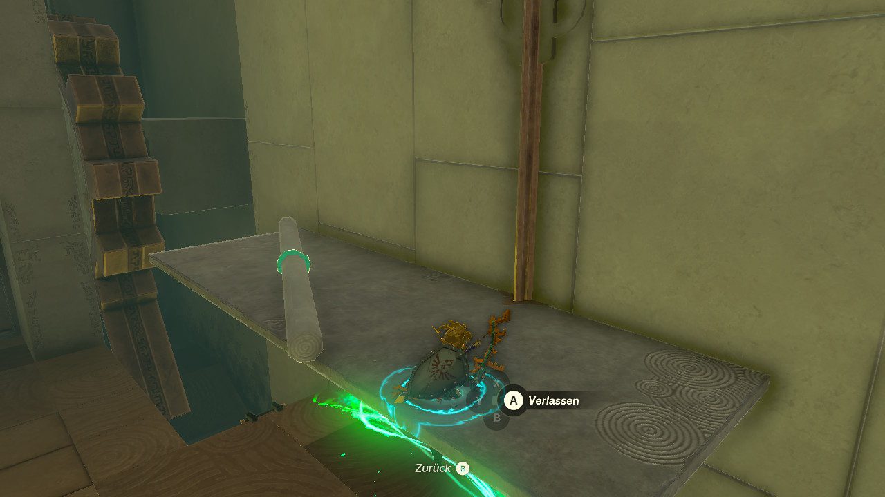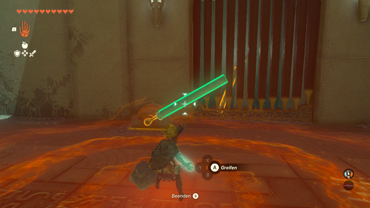 Im zweiten Raum wollen wir uns erst einmal der optionalen Truhe widmen, die rechts in der Nische auf einer erhöhten Position steht. Schnappt euch dafür via Ultra-Hand die Stange und montiert diese auf den Schalter, damit sie als Hebel fungiert. Kippt den Schalter mit der Ultra-Hand auf die andere Seite und eine Kammer öffnet sich, die ein weiteres Verbindungsstück enthält.