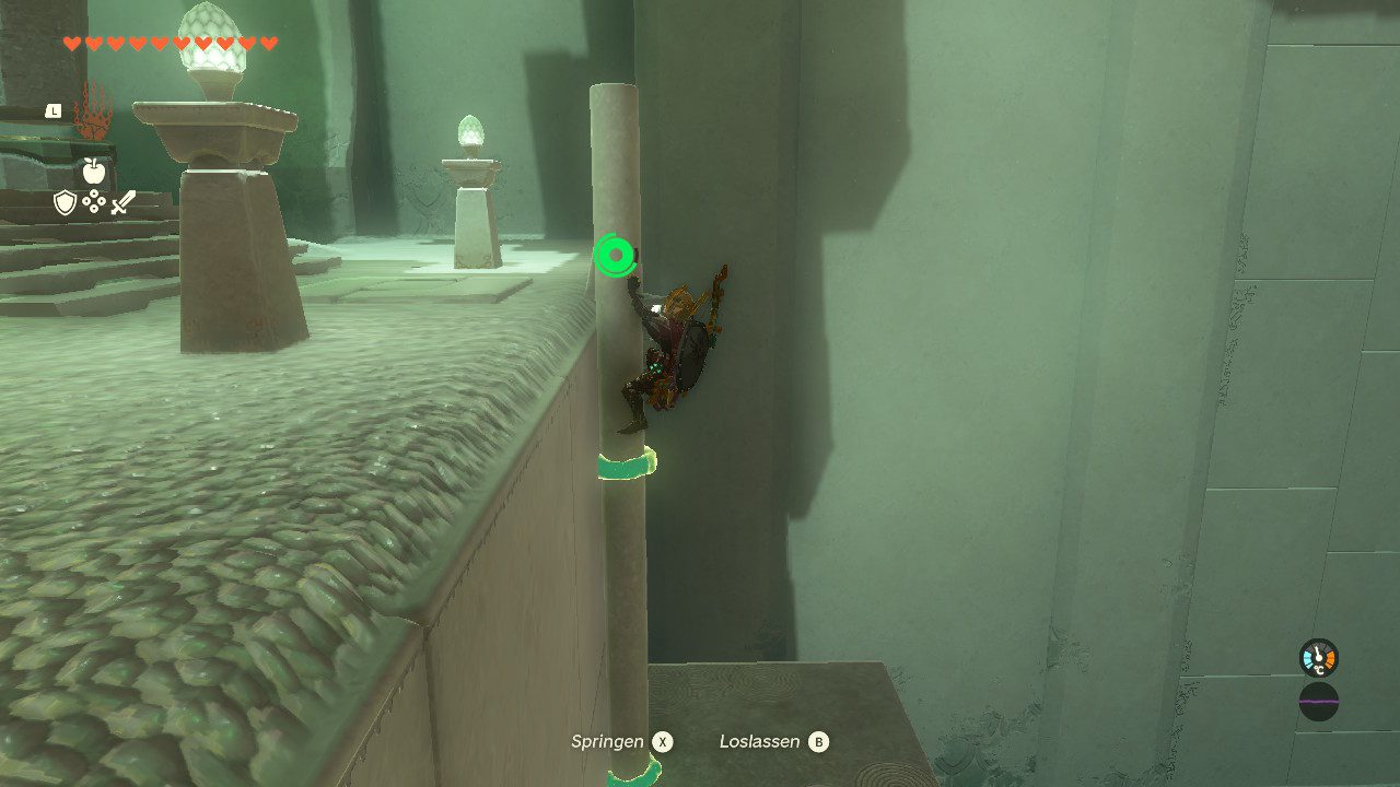 Richtet die lange Stange dafür auf und platziert sie so auf der kleinen Plattform, dass sie nach oben zeigt. Link kann das Konstrukt nun wie eine Regenrinne nach oben klettern, wodurch er problemlos das Ende vom Riogok-Schrein erreicht und sich sein neues Segenslicht abholen kann. Damit habt ihr die Prüfung komplett abgeschlossen und könnt euch wieder wichtigeren Dingen widmen.