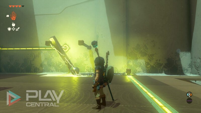 Sobald ihr den Schrein betreten habt, seht ihr vor euch gleich mehrere Dinge. Eine große, gelbe Energiezelle, die mit einer Eisenkugel verbunden ist, eine zweite Eisenkugel, die nicht unter Strom steht, und ein großes Wasserrad, das sich aber nicht bewegt, obwohl es eindeutig euer Ticket nach oben ist. Also was tun?