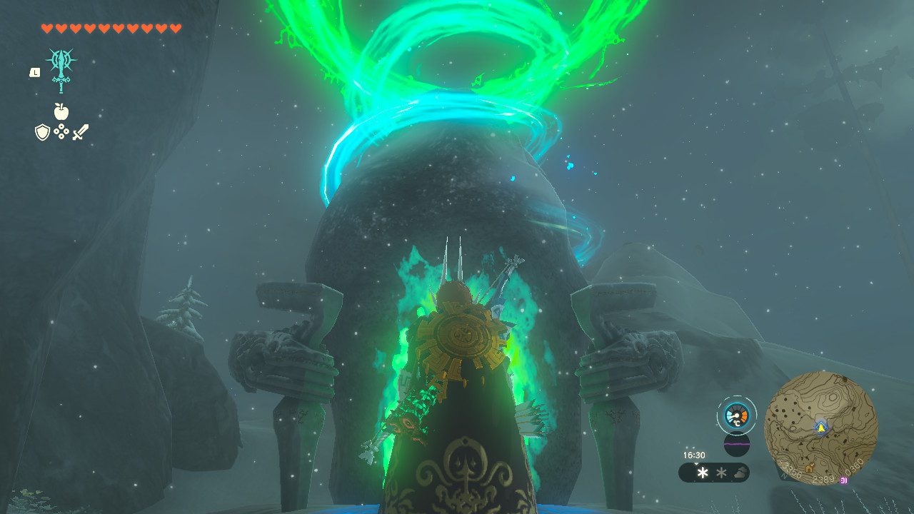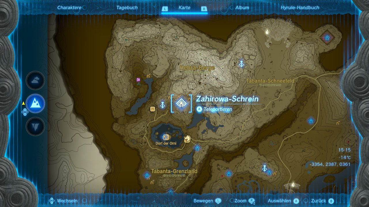 Falls nicht, raten wir euch, Klamotten, Medizin oder Proviant gegen extreme Kälte einzupacken, denn der Schrein befindet sich nördlich vom Dorf der Orni, direkt auf dem eiskalten Kassula-Berg. Solltet ihr noch keine warme Kleidung gefunden haben, werdet ihr in diesem separaten Guide fündig: Alle Rüstungen in Zelda: Totk – Rüstungswert & Set-Bonus jeder Ausrüstung im Überblick.