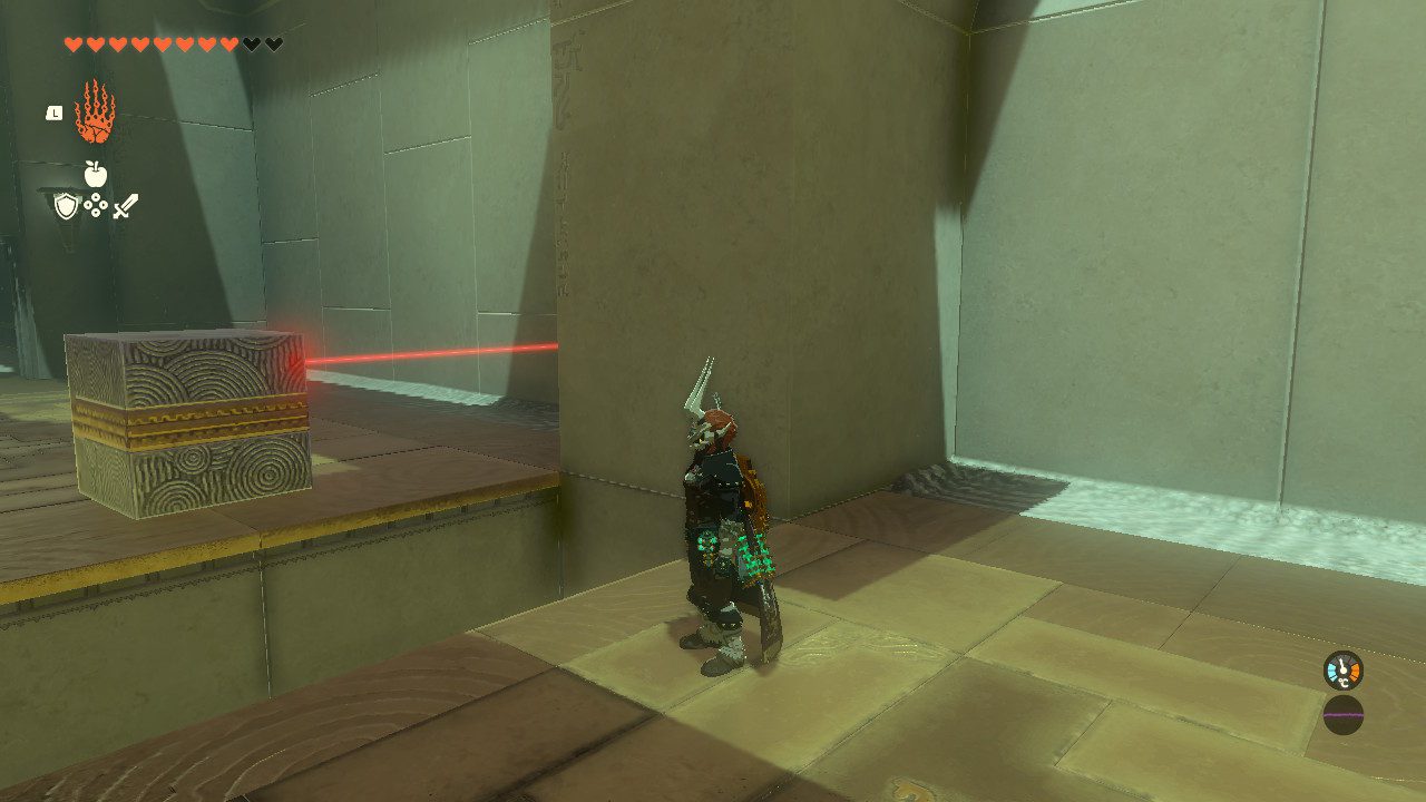 Lauft ein paar Meter in den Schrein hinein und ihr seht bereits den roten Laser, der stellvertretend für die Art des Rätsels ist, dass euch an diesem Ort erwartet. Berührt ihr den Laser nämlich, öffnet sich eine Falltür im Boden und Link stürzt in die Tiefe, was ihn einen ganzen Herz-Container kostet. Ein Schicksal, dass ihr natürlich vermeiden wollt, schon aus Zeitgründen.