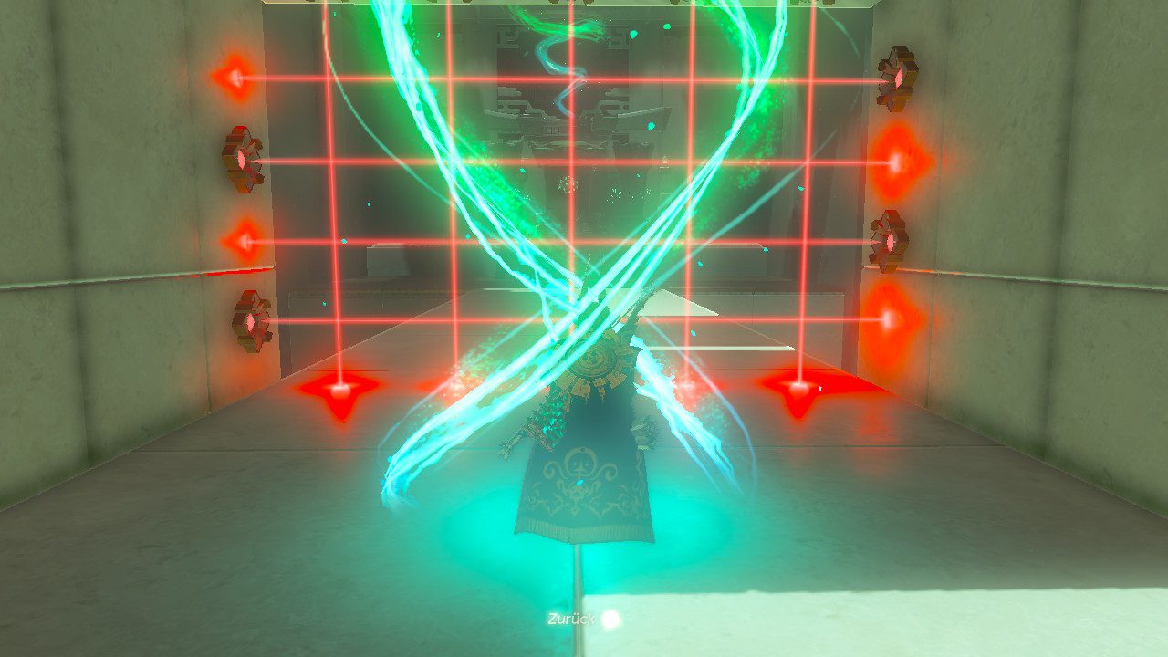 Stattdessen macht ihr es euch so einfach wie nur möglich und springt beim Laufen über den Laser drüber, wodurch gar nicht passiert, außer, dass der Recke von Hyrule seinen Weg fortsetzen kann. Im nächsten Gang wird es dann einen Tick schwieriger, denn nun habt ihr es direkt mit mehreren Laserstrahlen zu tun und manche davon sind sogar hintereinander angereiht.