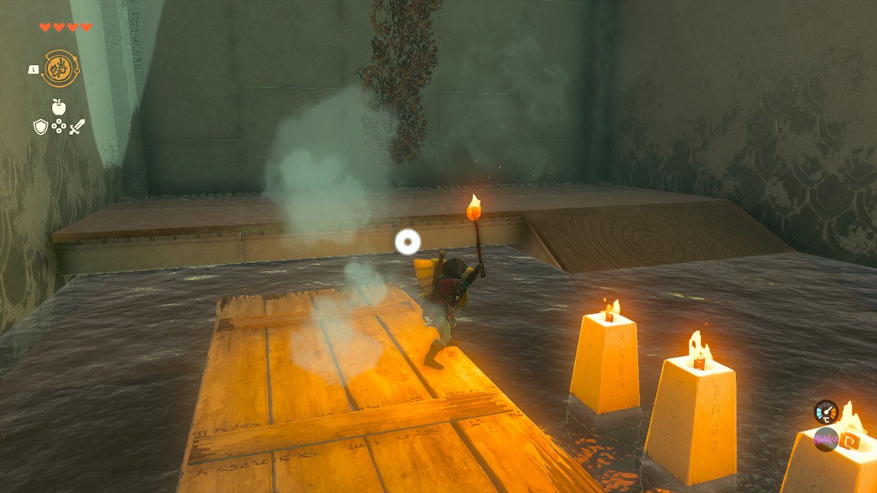 Mit der entflammten Fackel geht es aufs andere Ufer, wo ihr die Kletterpflanze an der Wand verbrennt, damit die Truhe nach unten fällt und euch mit Starker Konstruktbogen belohnt. Mit der Zeitumkehr schickt ihr das Floß und damit euch selbst nun zurück. Auf der anderen Seite angekommen, entfacht ihr die Feuerstellen links und rechts vor der Tür.