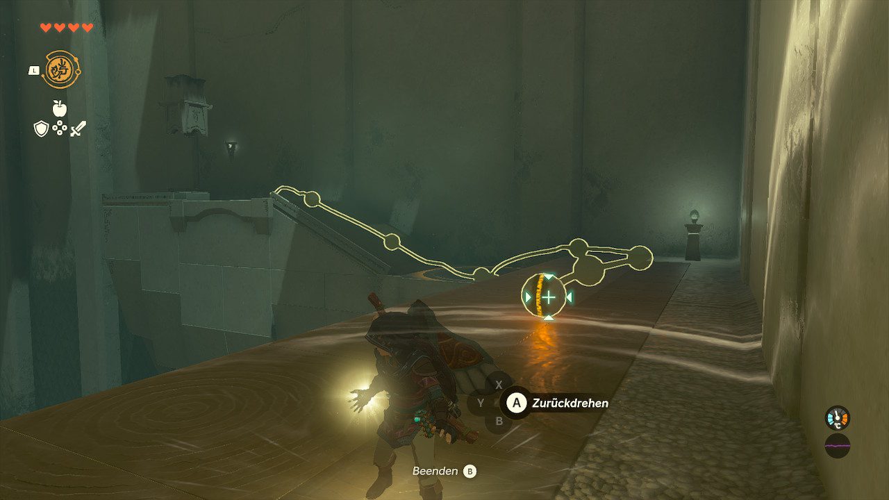 Doch zum Glück hat Link ja ein paar neue Spielereien, die er wie Asse aus dem Ärmel schütteln kann. Lauft also die Treppe nach oben und wartet, bis sich die mobile Plattform direkt neben euch befindet. Setzt dann die Zeitumkehr ein, wählt die Plattform als Ziel und springt drauf. Nun werdet ihr ganz gemütlich nach oben chauffiert.