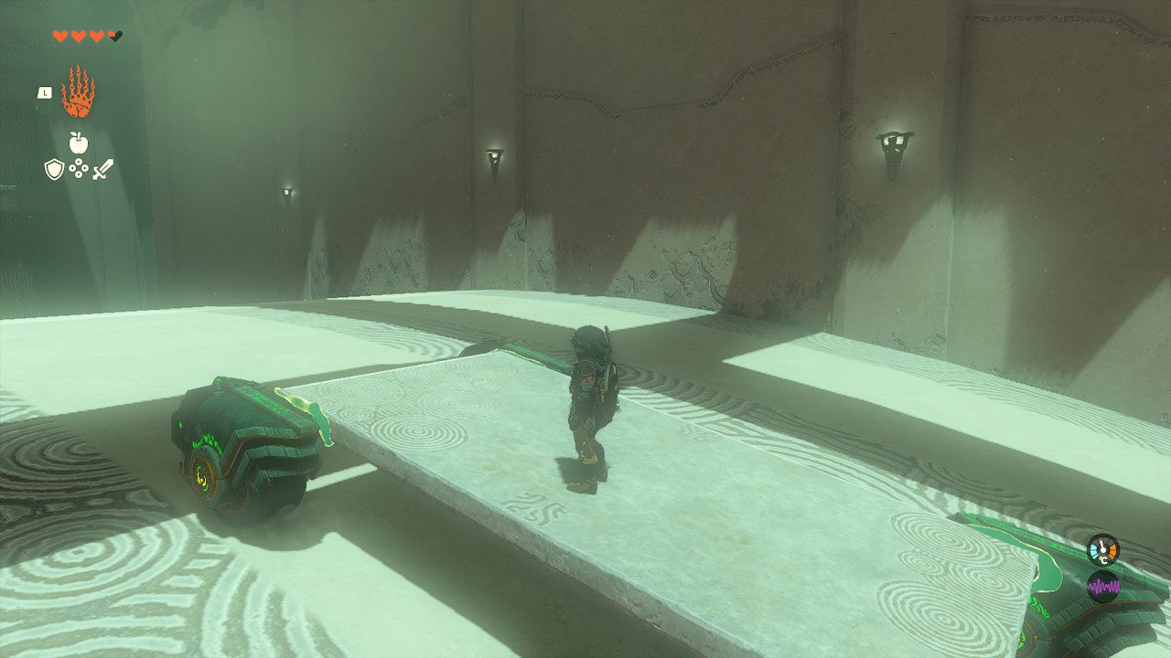 Aktiviert einfach die Ultra-Hand und schnappt euch einen der flitzenden Karren, indem ihr ihn beim Vorbeifahren auswählt. Setzt ihn vor die Rolle und springt schnell drauf, damit euch das Gefährt auf die andere Seite bringt. Solltet ihr beim Aufspringen Probleme haben, platziert Link einfach zwischen dem Wagen und dem Ziel.