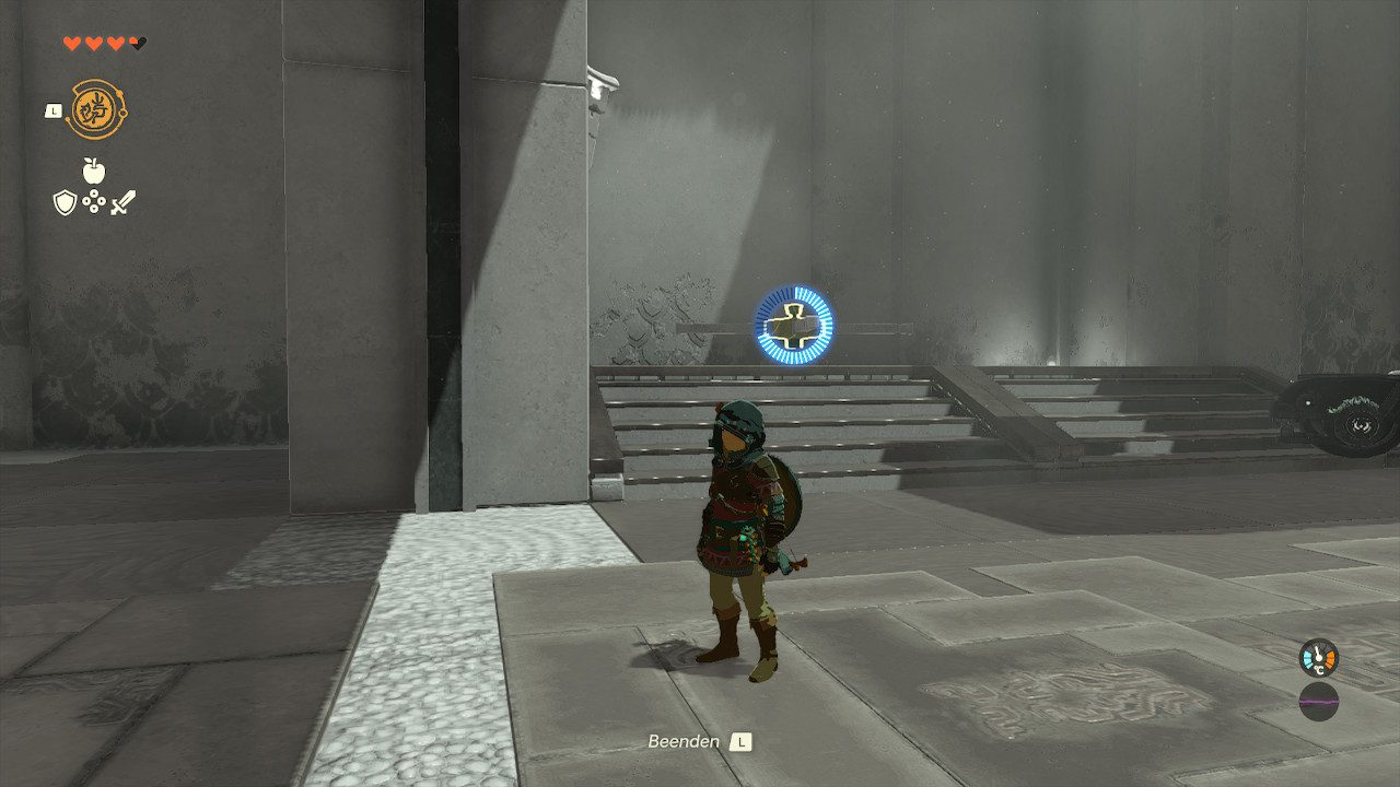 Dreht das Kreuz für einen längeren Moment und bewegt euch dann zum Tor, das bei eurer Ankunft natürlich wieder geschlossen sein wird. Nutzt nun die Fähigkeit Zeitumkehr und wendet diese auf das Drehkreuz an. Solange dieses sich dreht, und sei es auch rückwärts, ist der Durchgang frei und Link kann sich dem letzten Rätsel-Raum stellen.