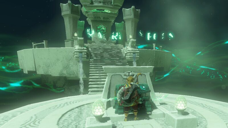 Wenn ihr diesen mit einem Donnerpfeil wegsprengt oder den Schwur von Yunobo den Weisen aktiviert, um ihn hier gegenzuwerfen, kann das Wasser rund um den Schrein ablaufen.