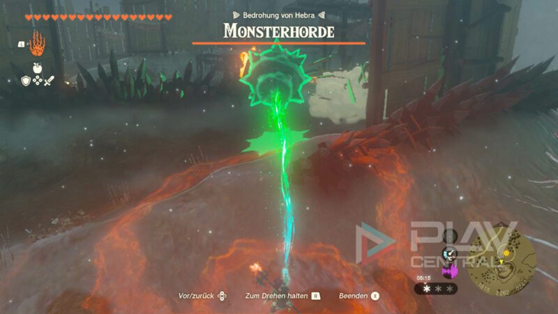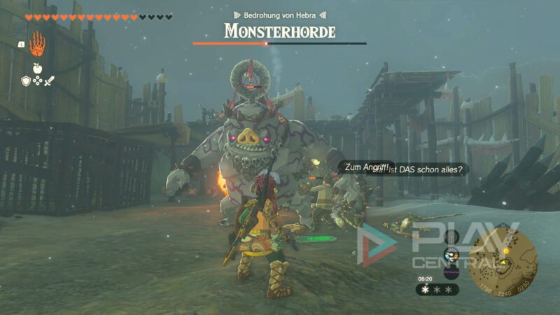 Ihr müsst sämtliche Monster im Inneren des Forts ausschalten, bis auf das letzte Vieh. Das ist die Bedrohung von Hebra. Erst dann habt ihr diesen Angriff erfolgreich überstanden.