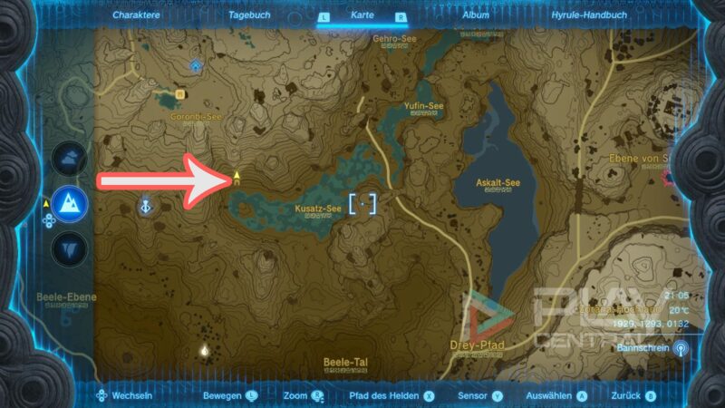 Der Kusatz-See befindet sich östlich vom Turm in der Schlucht von Eldin. Also teleportieren wir uns zu diesem Ausgangspunkt und fliegen gen Osten! Die Höhle am Kusatz-See befindet sich links außen am See (siehe Bild).